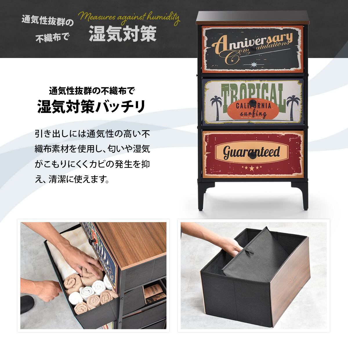 引き出しには通気性に優れた不織布を使用しているので、カビや臭いの原因となる湿気がこもりにくく快適にご使用いただけます。