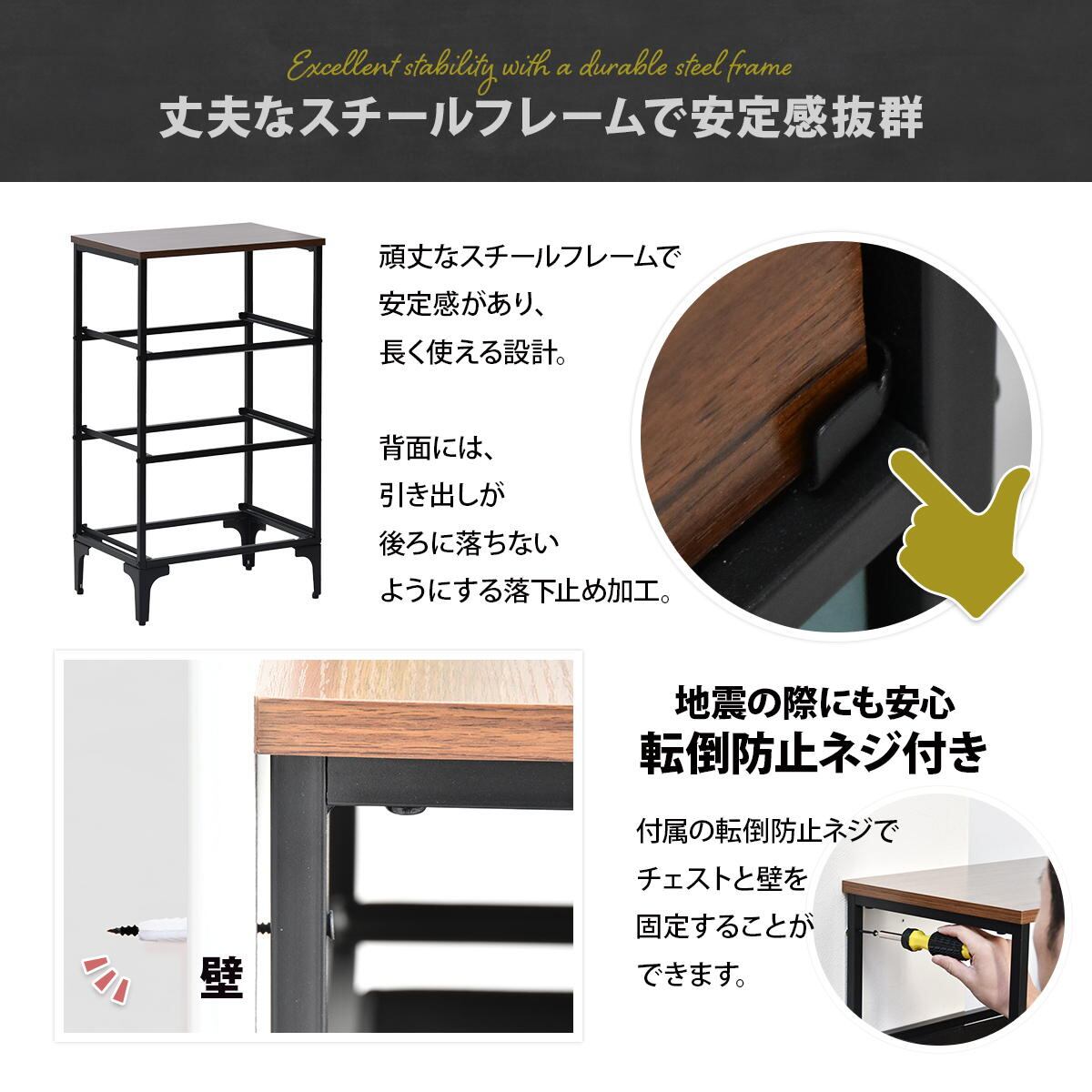 チェストフレームはスチールフレームで、頑丈で安定感があります。