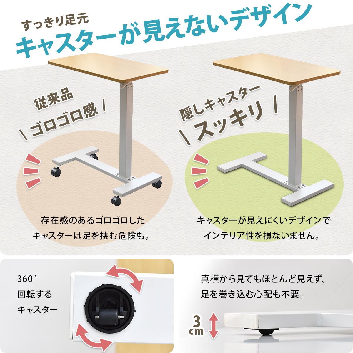 隠しキャスター付きで、360度回転することができ、スチールフレームと足元の補強パーツでぐらつきを軽減し、しっかりとした安定感のあるサイドテーブルです。