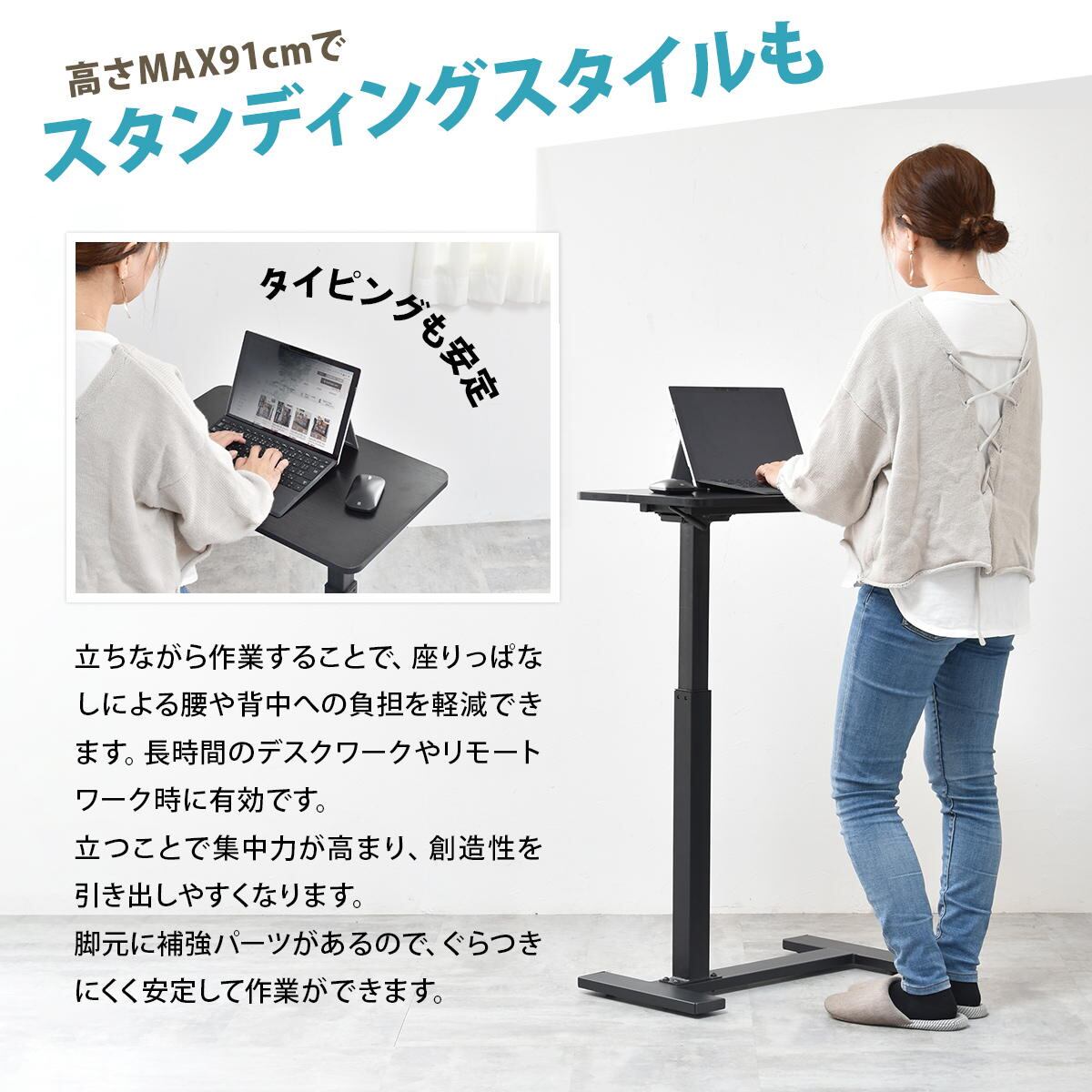 ガス圧昇降式で高さ63.5cm〜91cmまで、無段階で高さ調整が可能です。