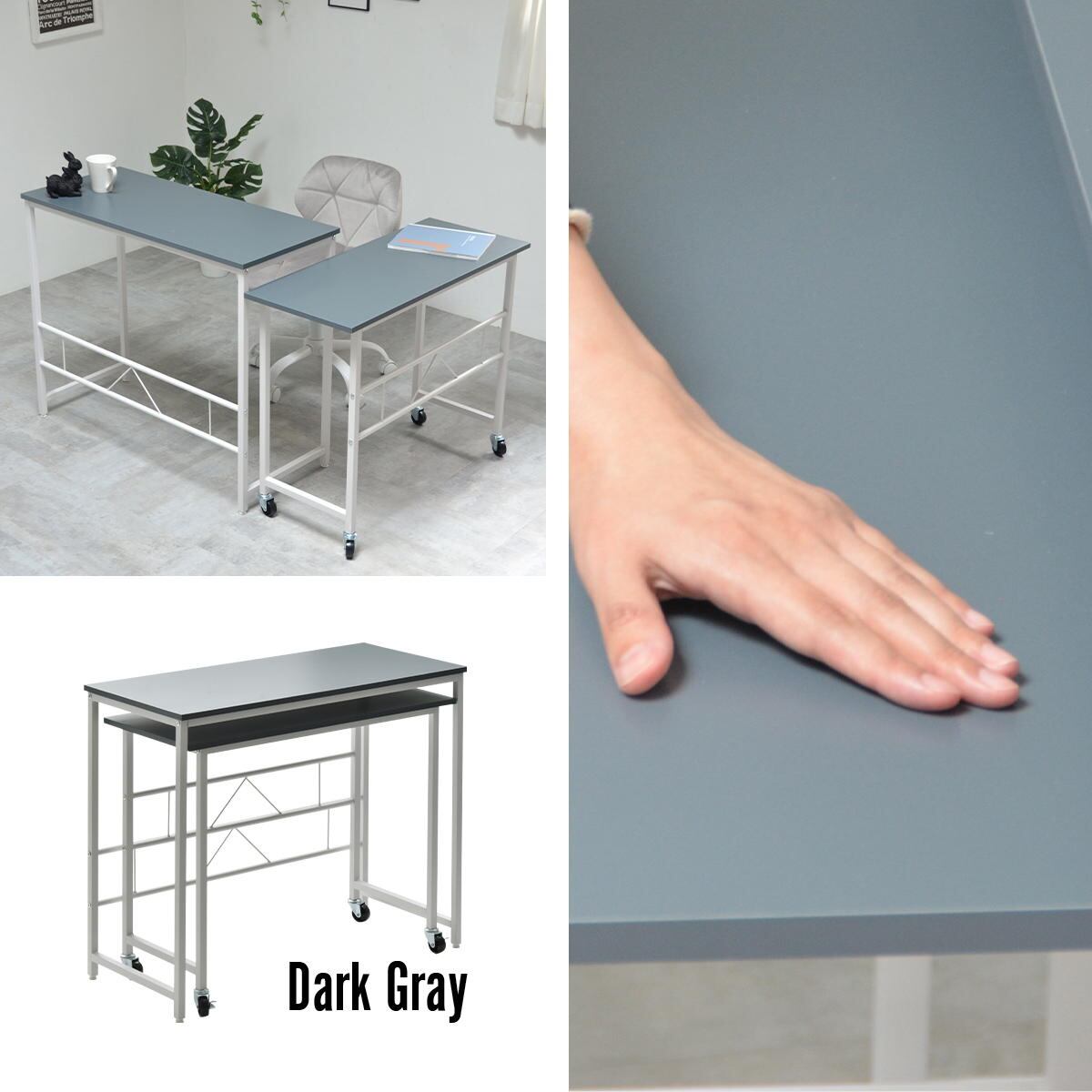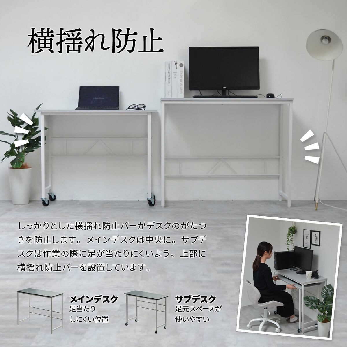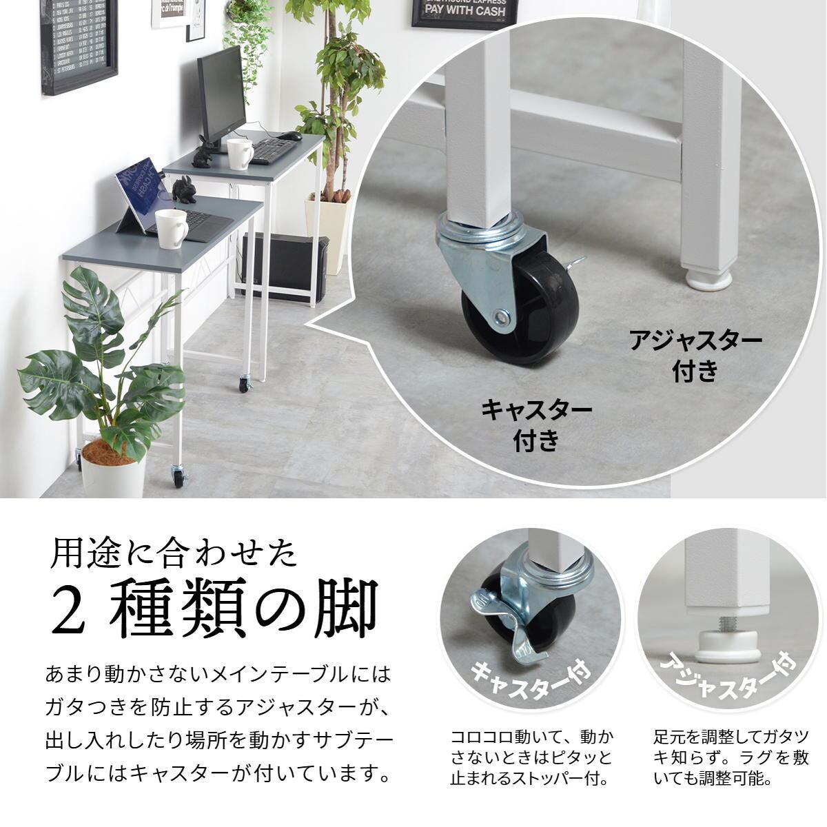 あまり動かさないメインの大サイズデスクにはガタ付きを防止するアジャスターが付いており、出し入れしたり場所を動かす小サイズのサブデスクにはキャスターが付いています。