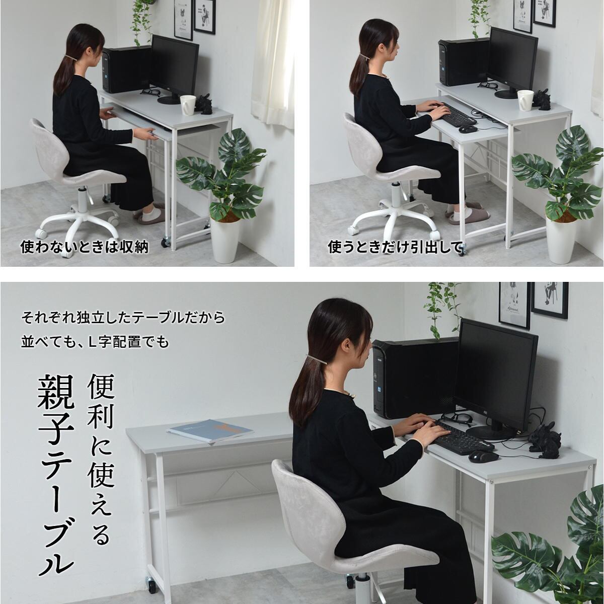 小デスクはキーボードが収まる高さなので、必要な時に引き出してキーボード台として使用し、不要な時にはメインデスク下に収納して作業スペースを確保できます。