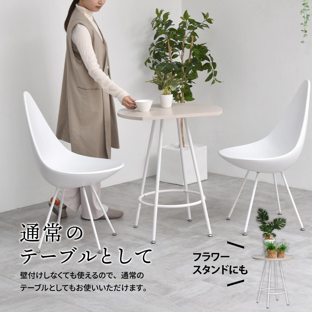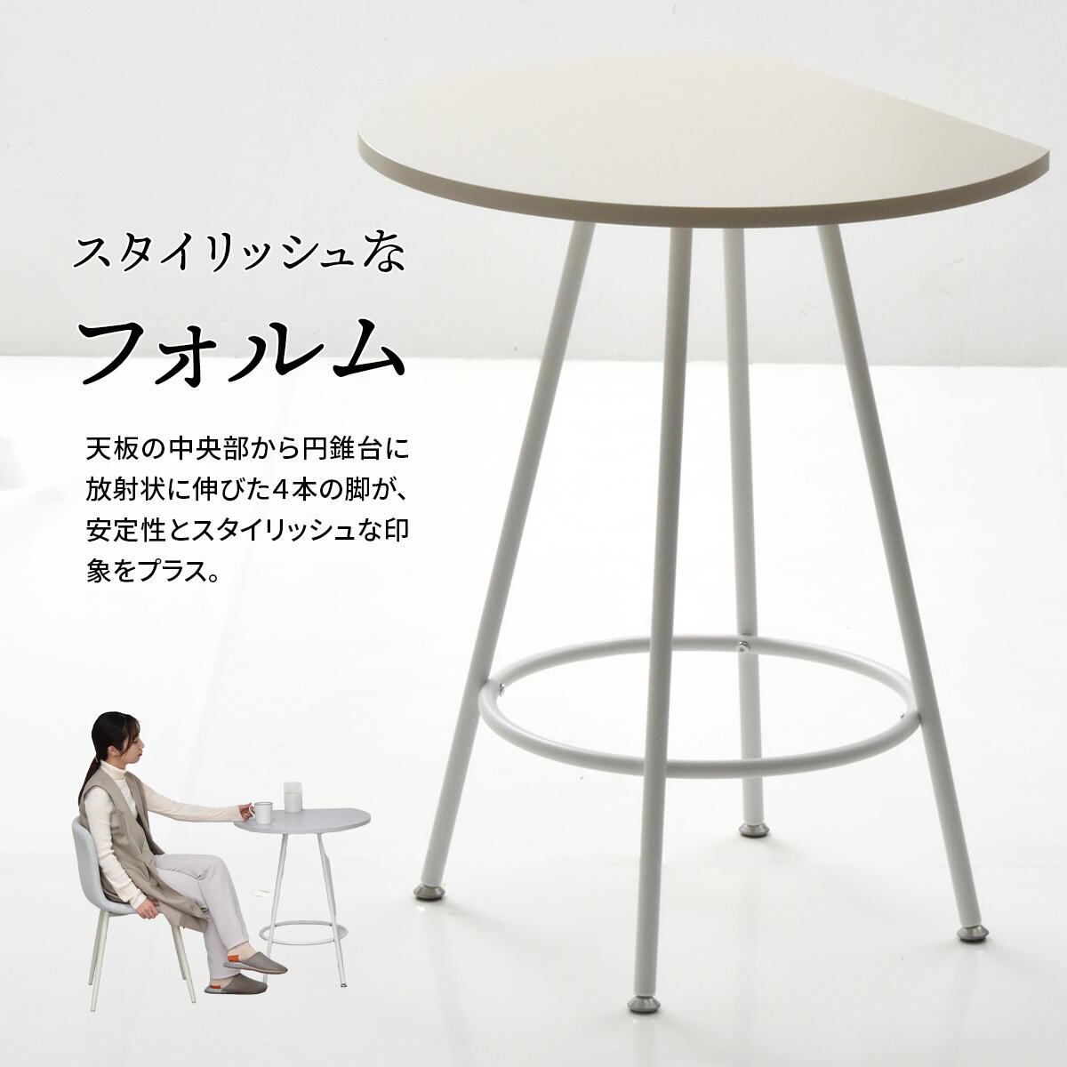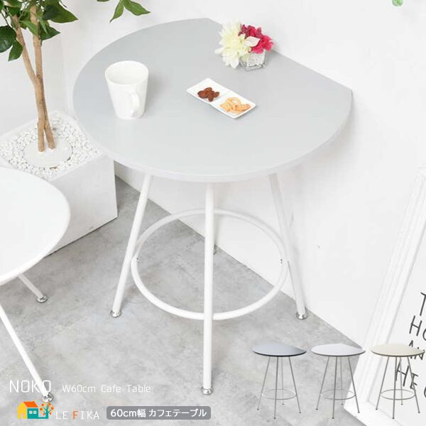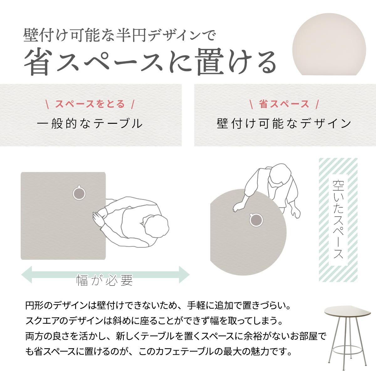 空間に柔らかみを与える円形天板の一部をカットする事で、壁付け設置を可能にし、省スペースを実現した60cm幅のカフェテーブルです。