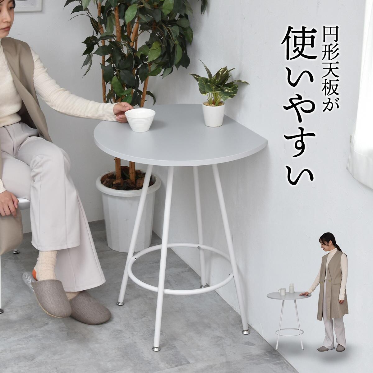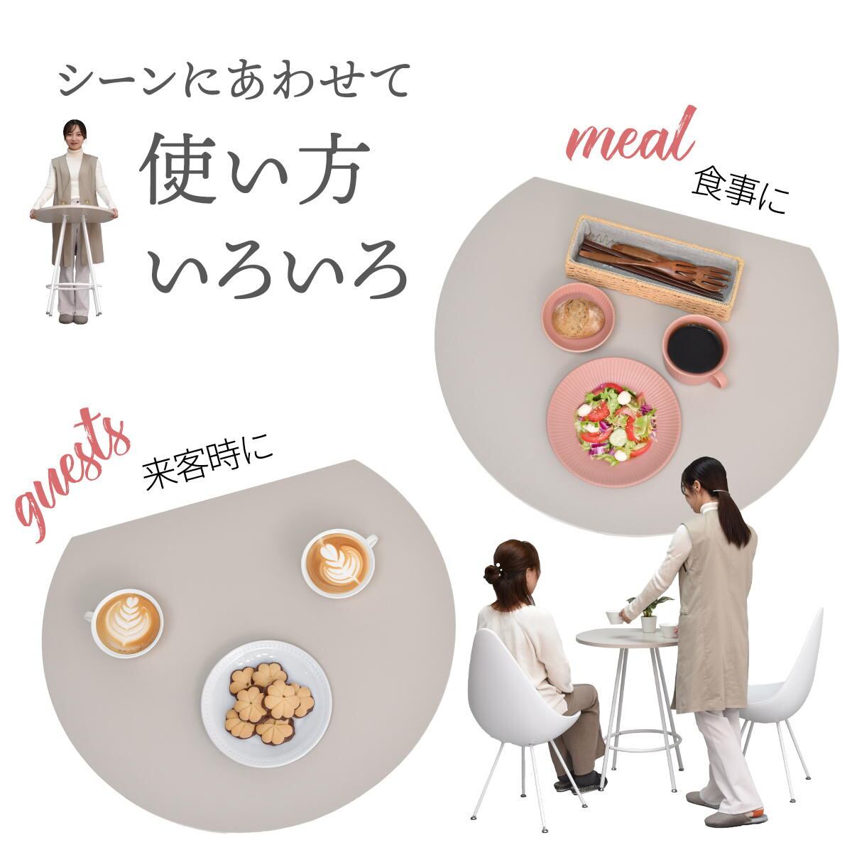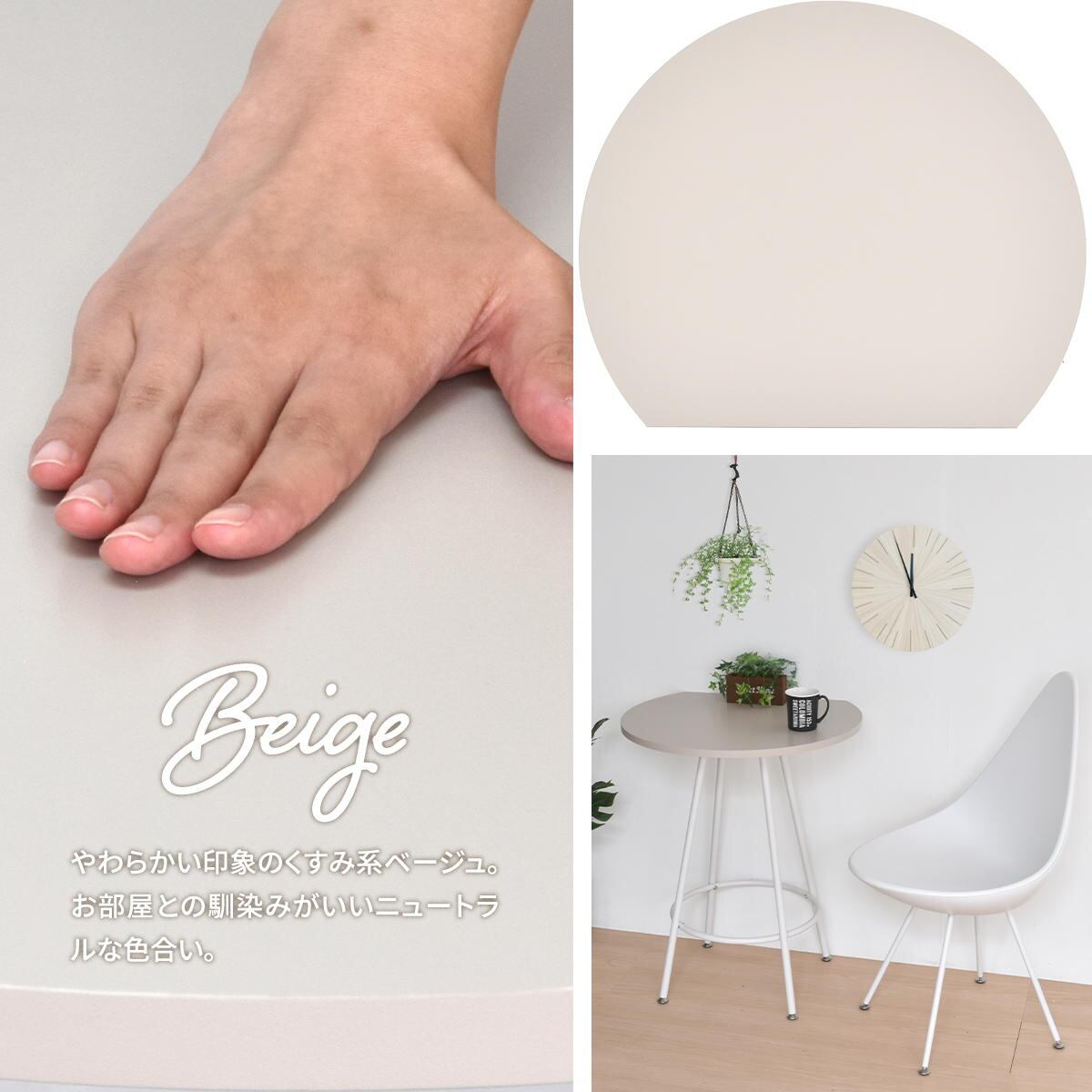 空間に柔らかみを与える円形天板の一部をカットする事で、壁付け設置を可能にし、省スペースを実現した60cm幅のカフェテーブルです。