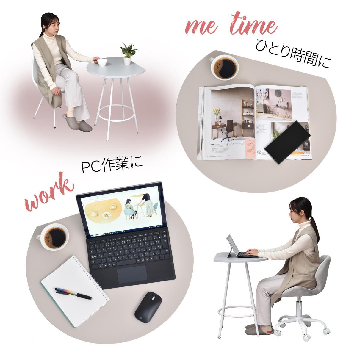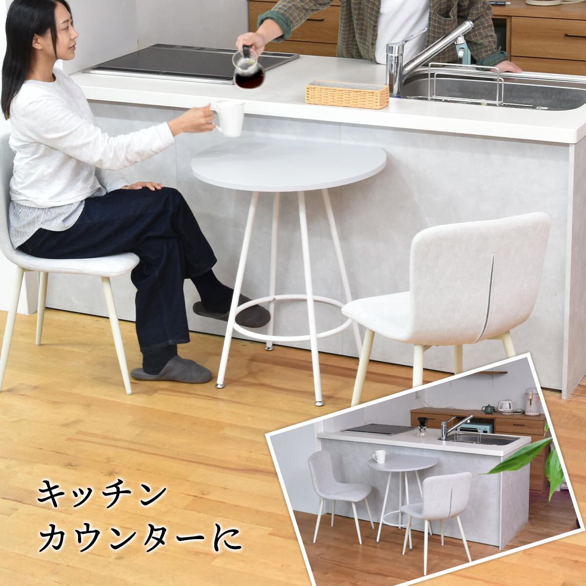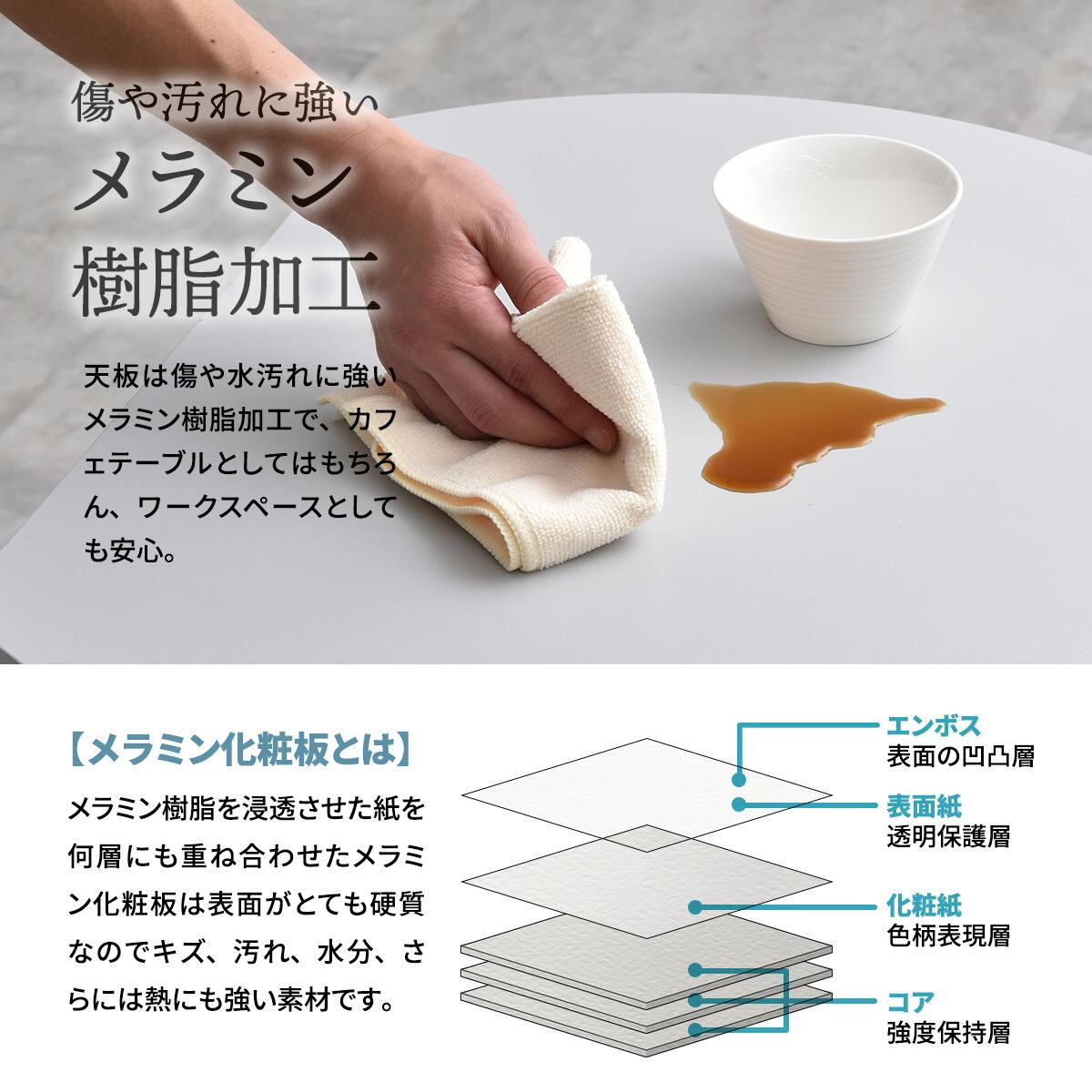 天板は傷や水汚れに強いメラミン樹脂加工を施しておりますので、カフェテーブルとしての使用以外にも一人用のダイニングテーブルやパソコン作業スペースとしても安心してご使用頂けます。