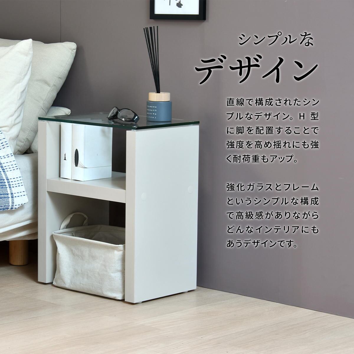 シンプルなデザインでいろんなテイストにもマッチしやすく、飽きのこないデザインの38cm幅のガラス天板ナイトテーブルです。
