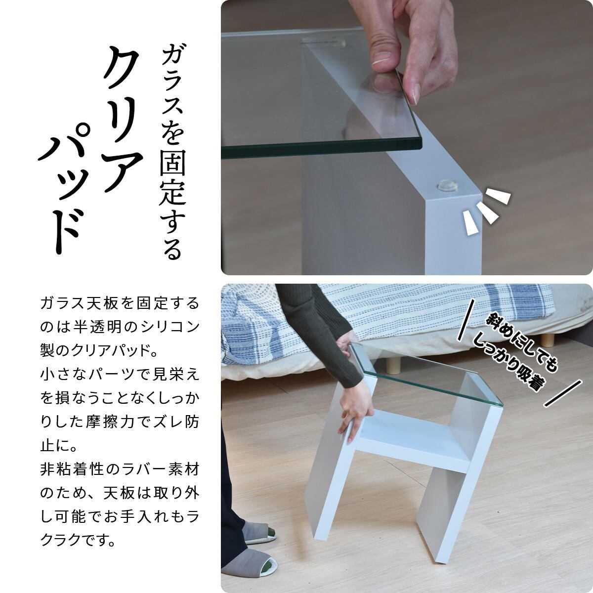 天板には8mmの強化ガラスを使用しており、強化ガラスの角は滑らかに磨いた面取り加工を施しています。