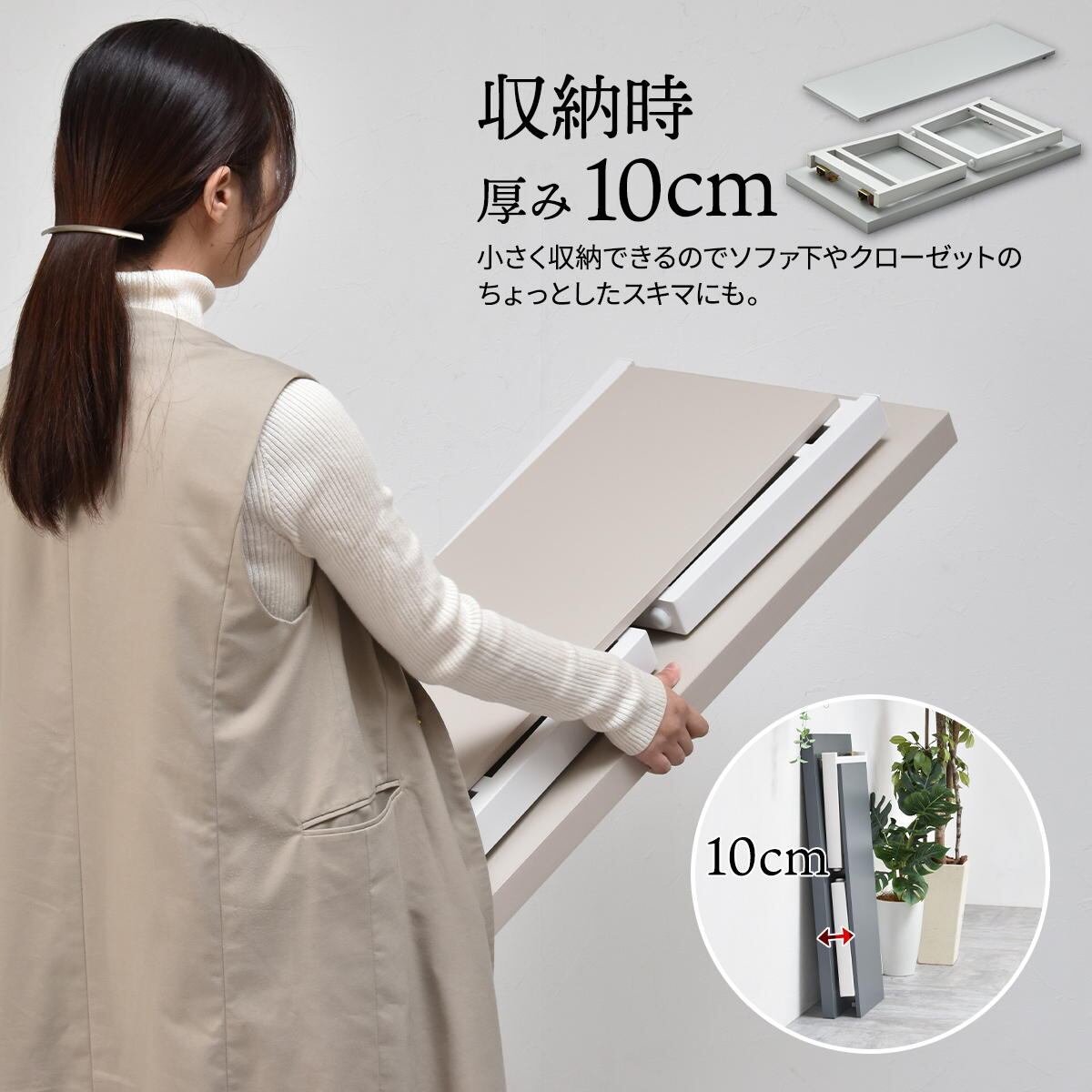 脚を折り畳んだ際の厚みは(約)10cm程度までコンパクトになるので、ソファ下やベッド下などのちょっとした隙間に小さく収納できます。