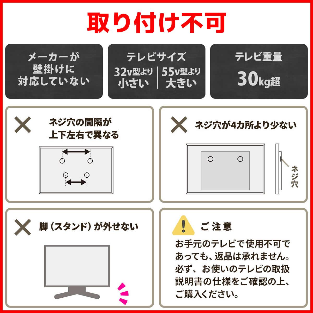 ・ご注文前に必ずお取り付け頂くテレビが対応しているかご確認ください。(※取り付けられない等、お客様ご都合の返品、交換は承りかねます。)