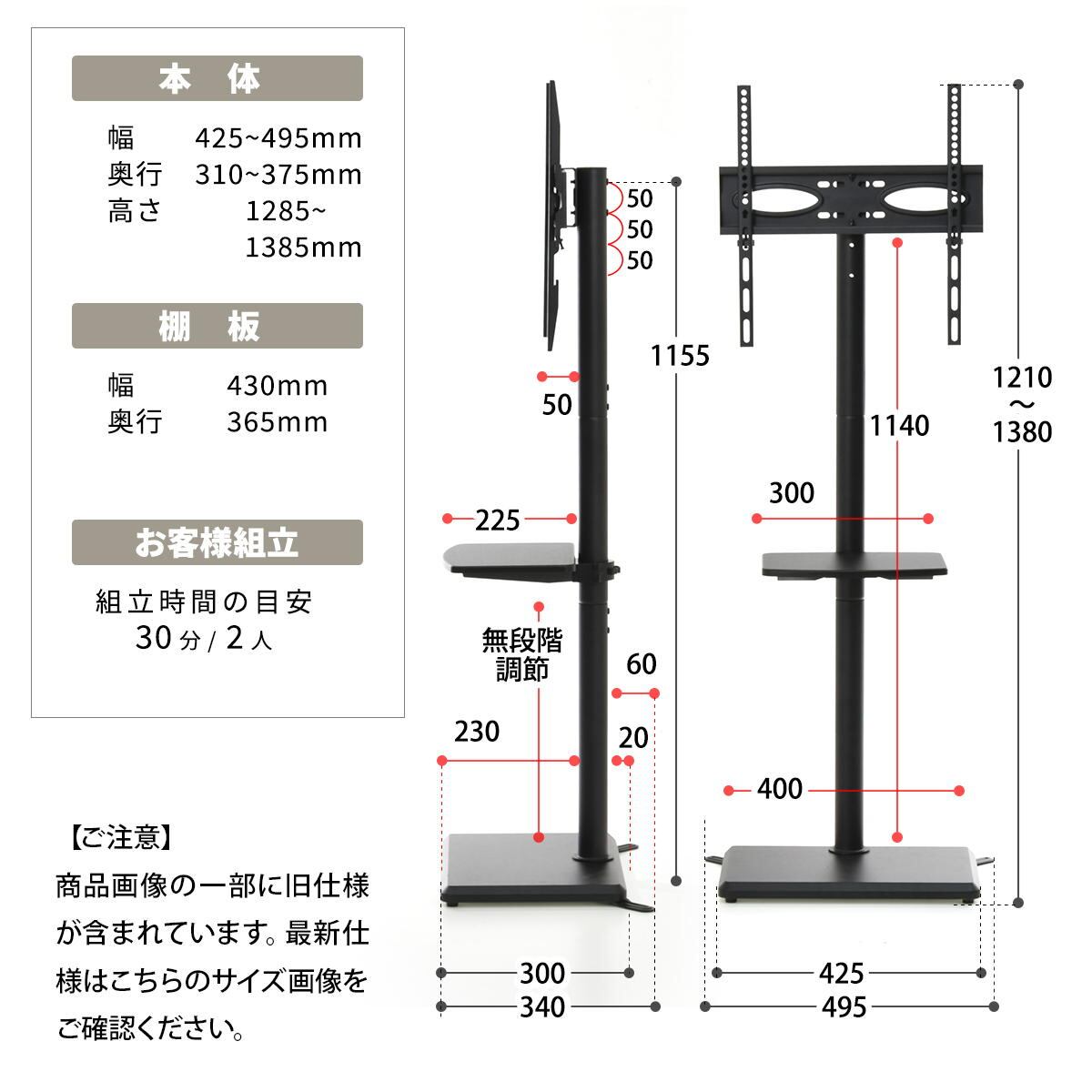 32型〜55型までのテレビに対応した本体耐荷重(約)30kgの壁寄せタイプの棚付きテレビスタンドです。