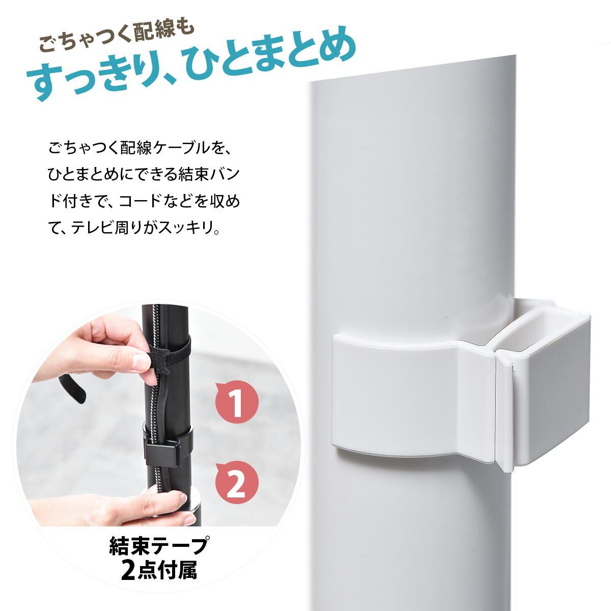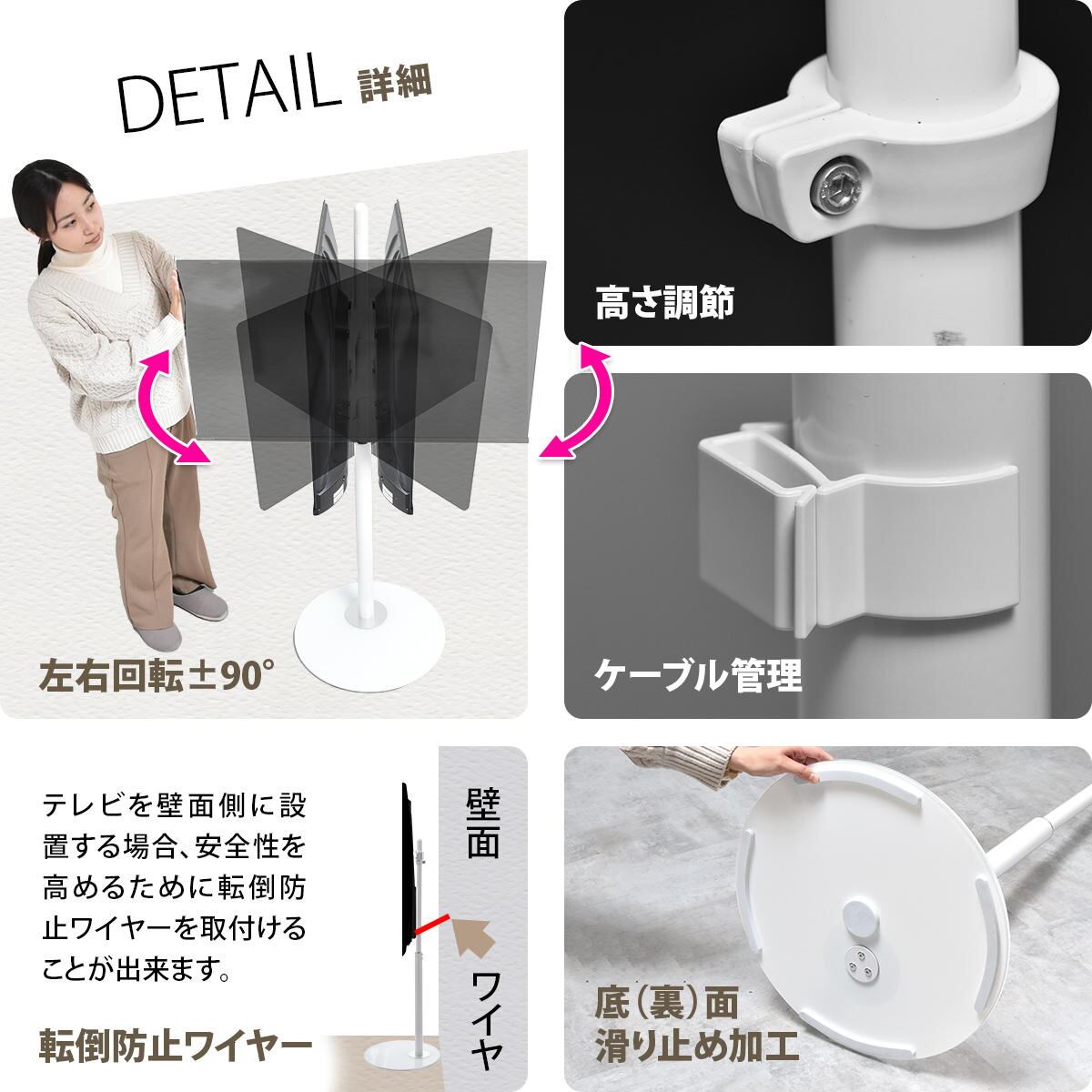 円型ベースの台座で、テレビを壁面側に設置する場合、安全性を高めるために転倒防止ワイヤーを取り付けることができます。