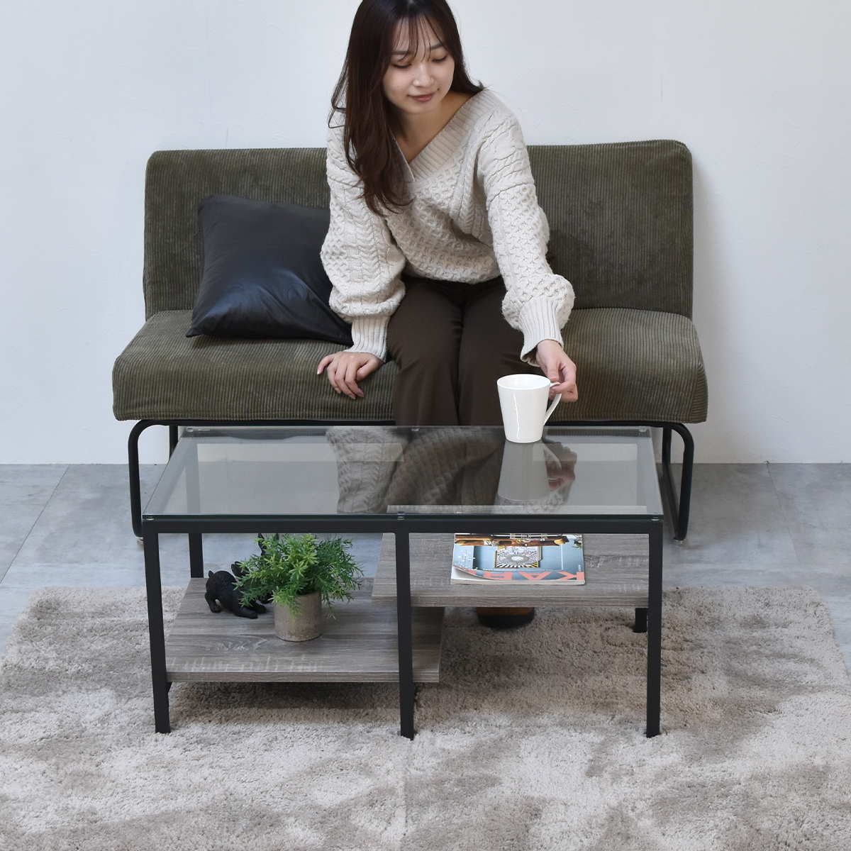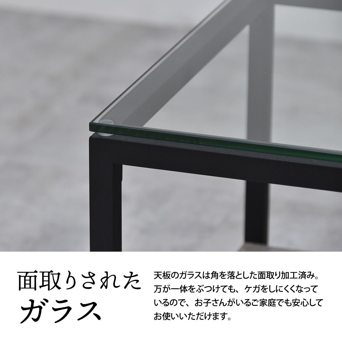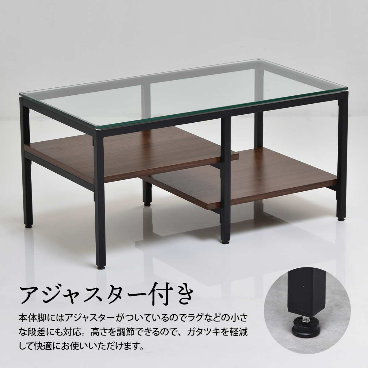 強化ガラス製の天板と左右で高さの違う棚板を備えた80cm幅のガラスセンターテーブルです。