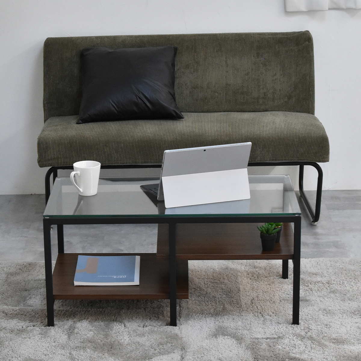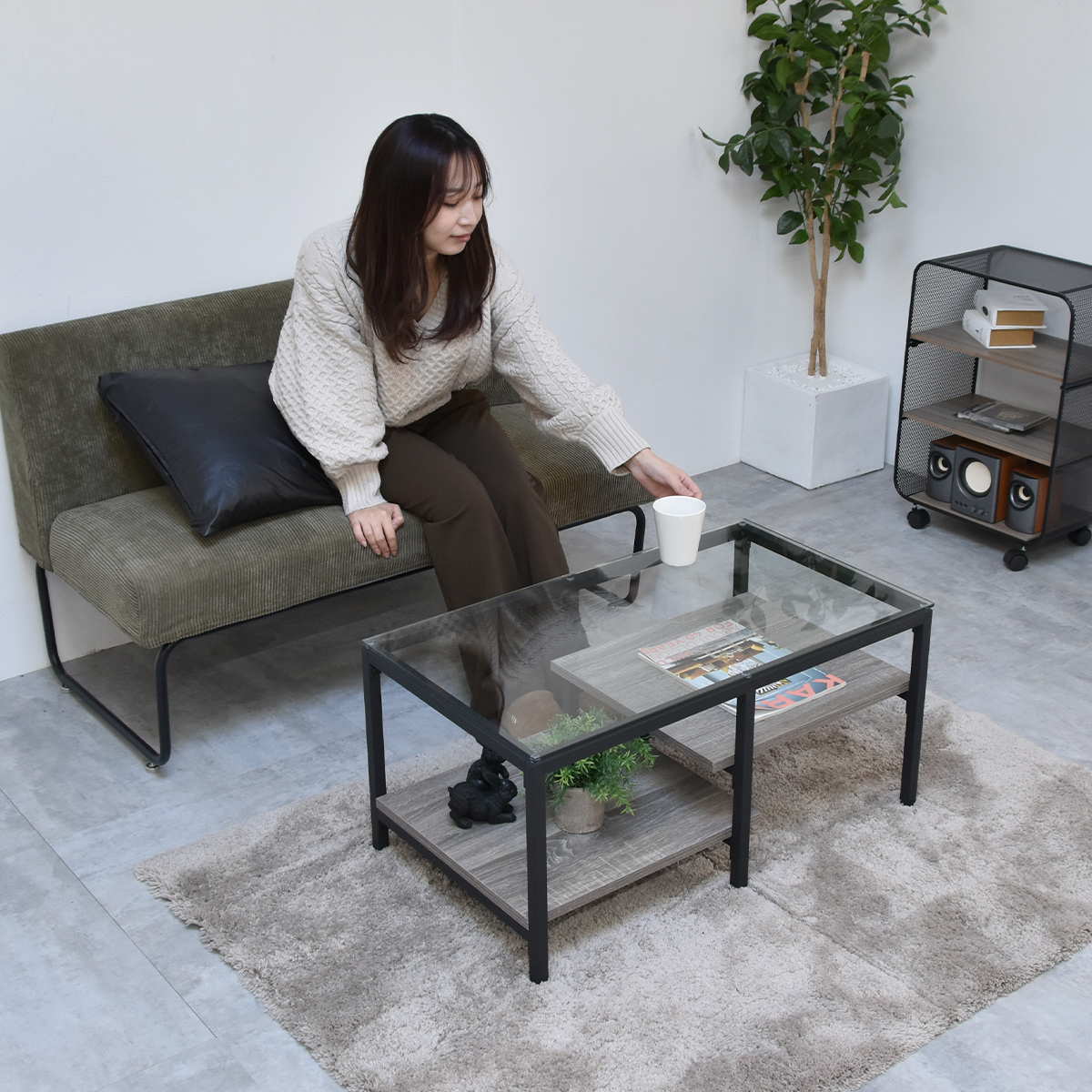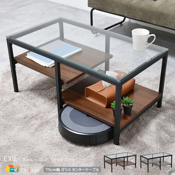 強化ガラス製の天板と左右で高さの違う棚板を備えた80cm幅のガラスセンターテーブルです。