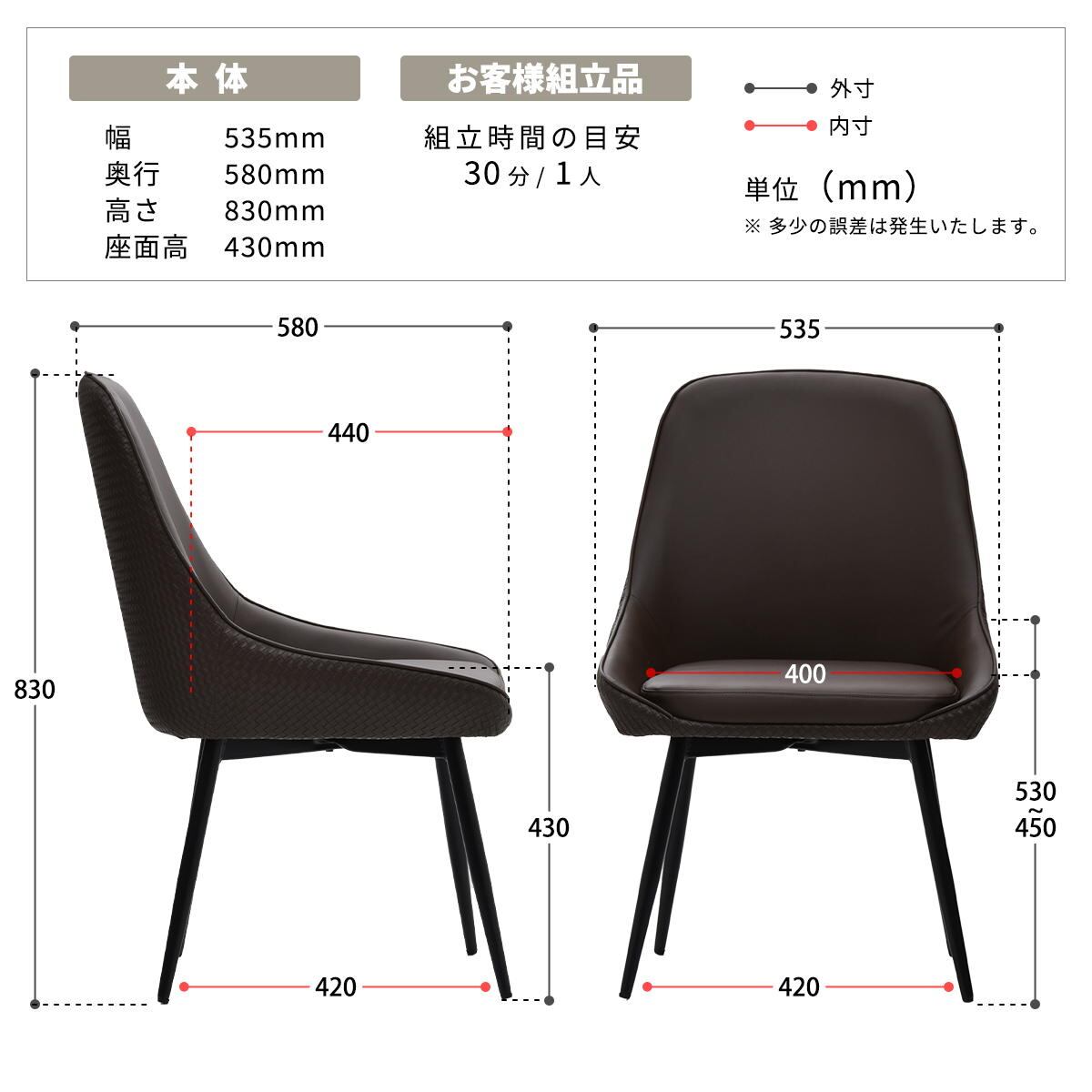 ■商品サイズ(1脚あたり)(約):幅53.5cm、奥行58cm、高さ83cm、座面高43cm