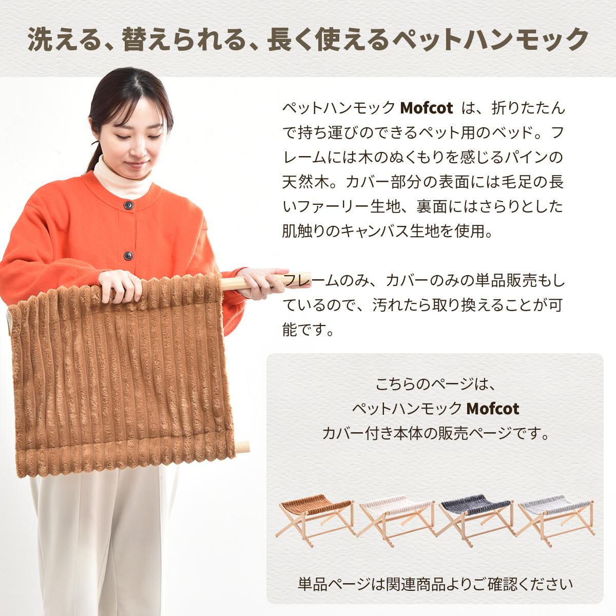 ハンモックフレームには天然木を使用しており、カバー部分の表面には毛足の長い肌触りの良い生地、裏面にはさらりとした肌触りのしっかりめの生地を使用しております。