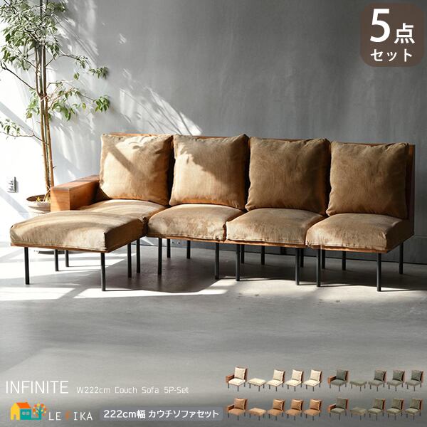 肘掛けの無いシンプルでコンパクトなサイズ感が魅力の52cm幅の1人掛けソファ3脚、片肘収納付きソファ1脚、オットマン1脚、合計5点がセットになった4人掛けカウチソファセットです。