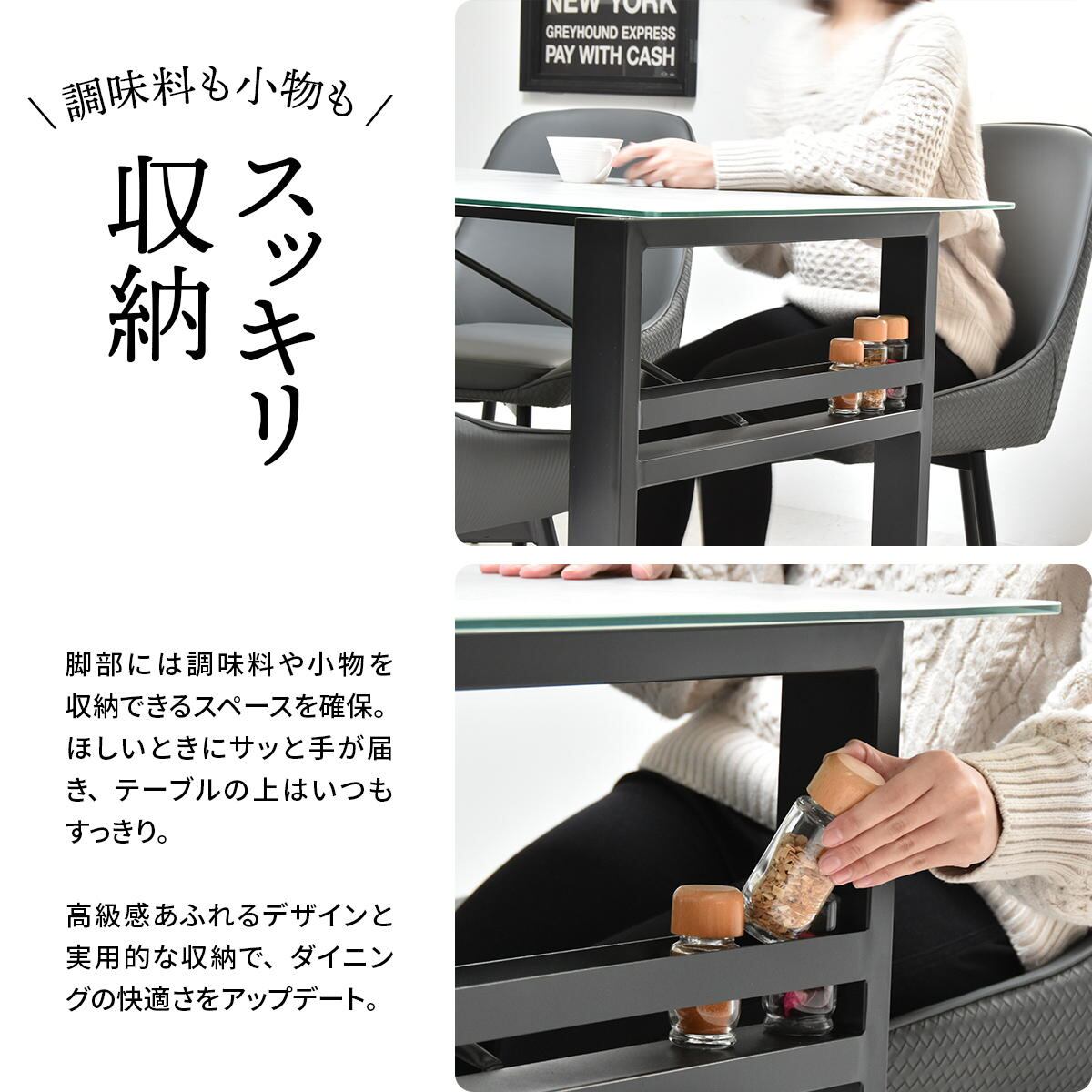脚部には収納機能を備えさせることにより、テーブル周りの調味料や小物などを収納できるので、実用的です。