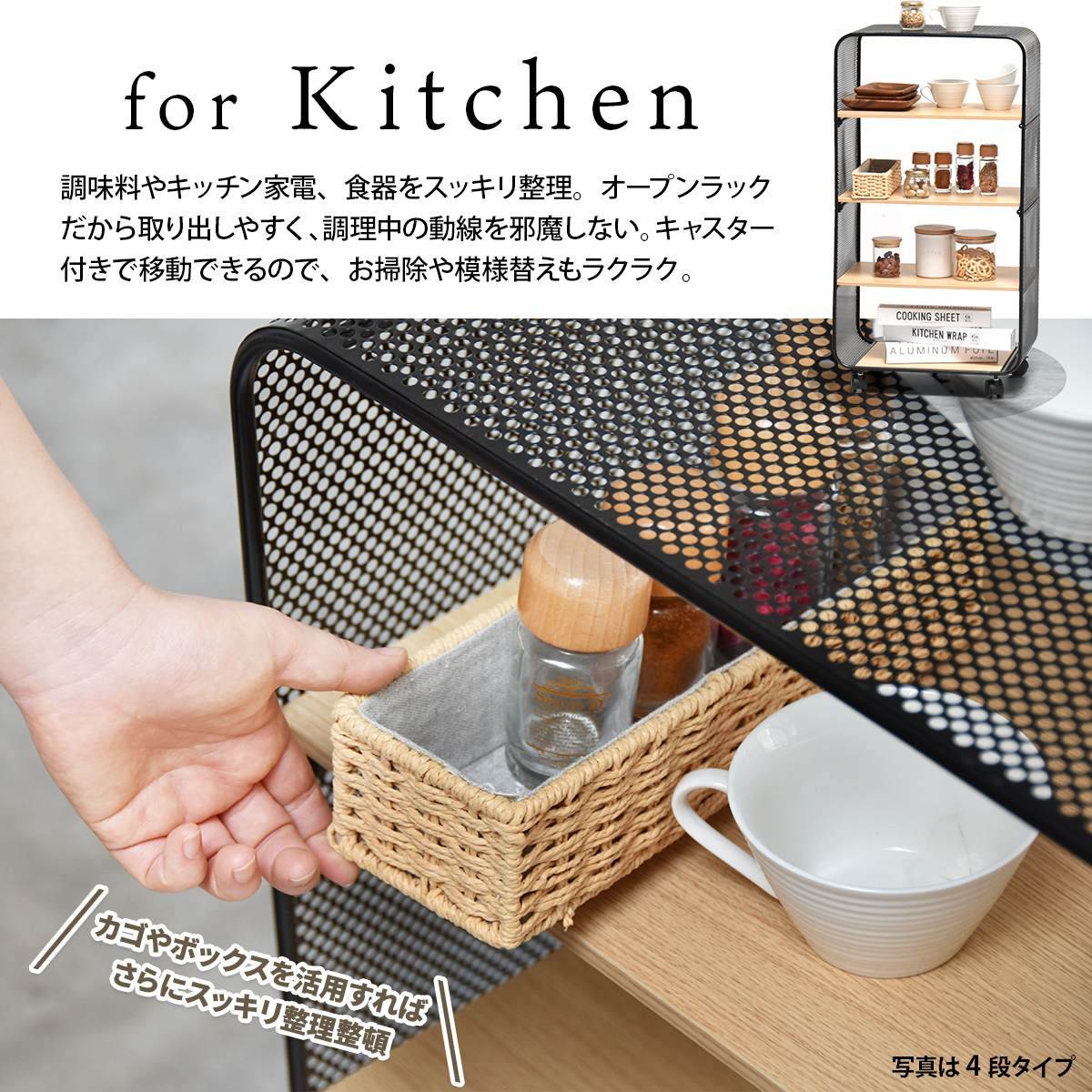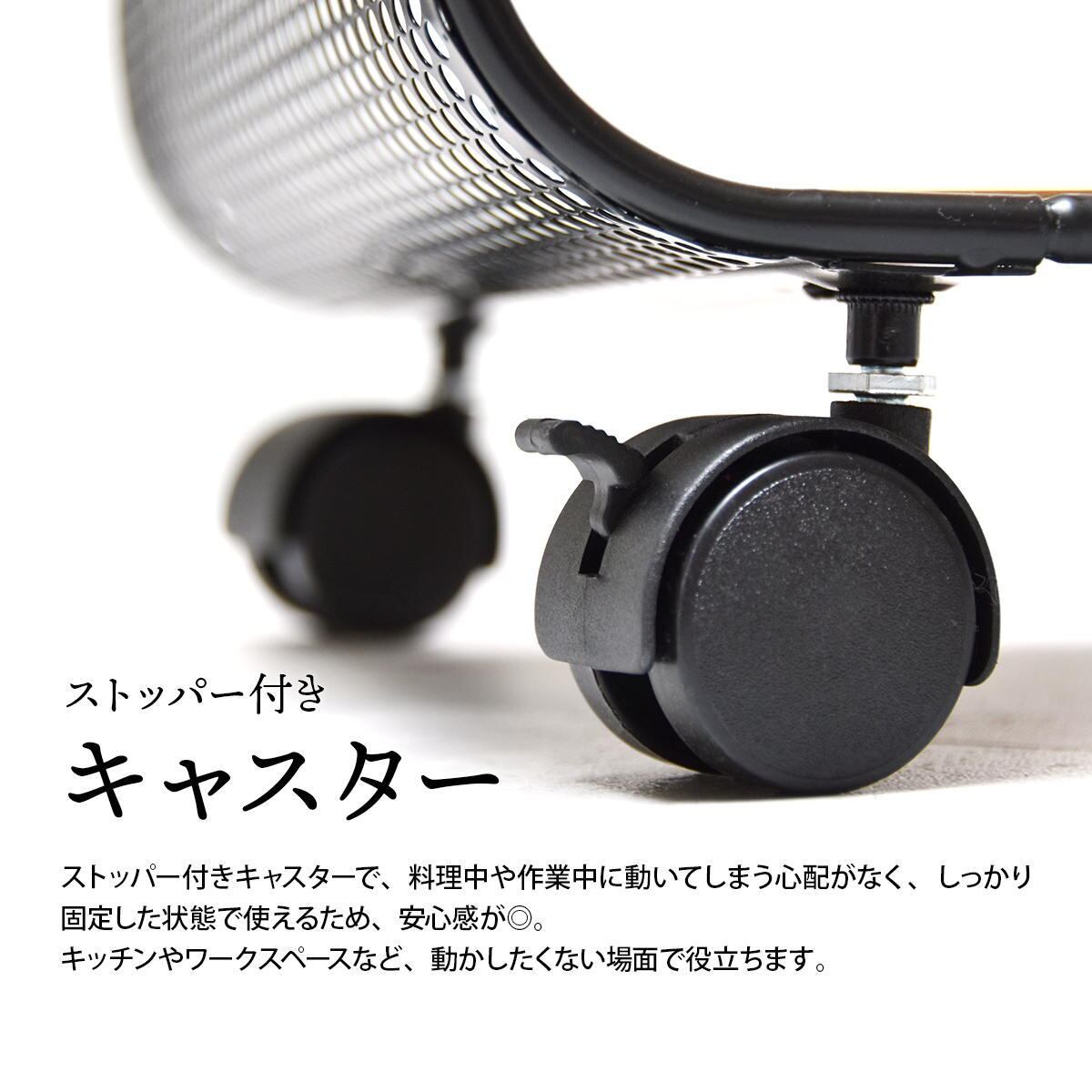 ブラックのスチールフレームと、木目調の棚板でスタイリッシュなデザインに仕上げた機能性にもデザイン性にもこだわったキャスター付きラックです。