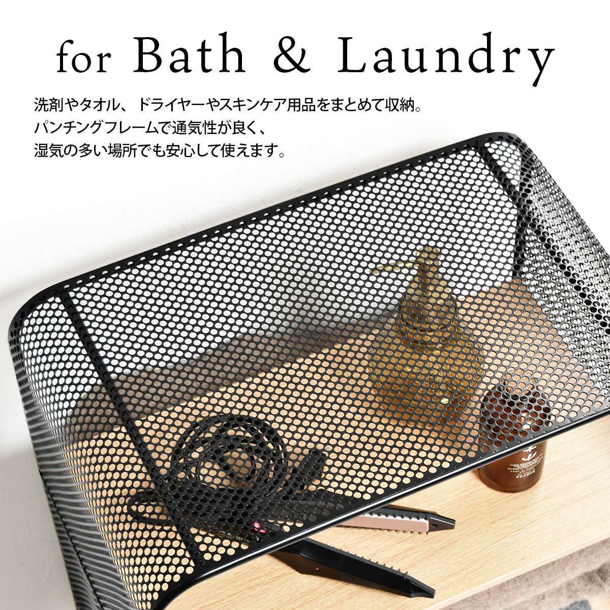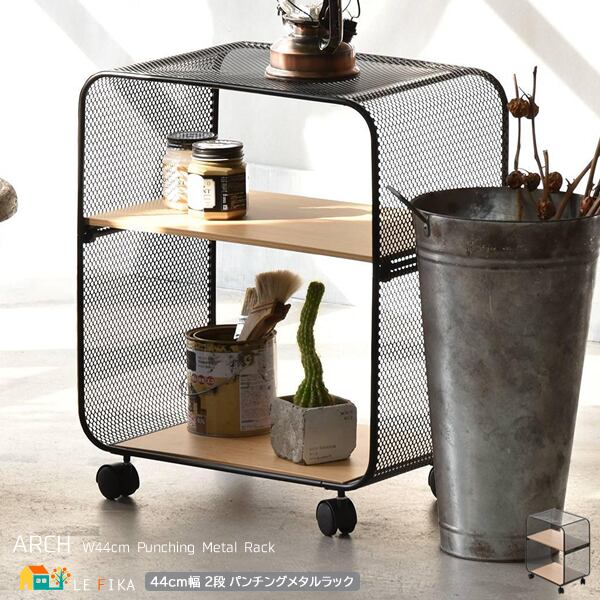 アーチ型のパンチングメタル(スチール製)を使用しており、メッシュ網よりも強度が強く、キャスター付きで移動も簡単な2段タイプのパンチングメタルラックです。