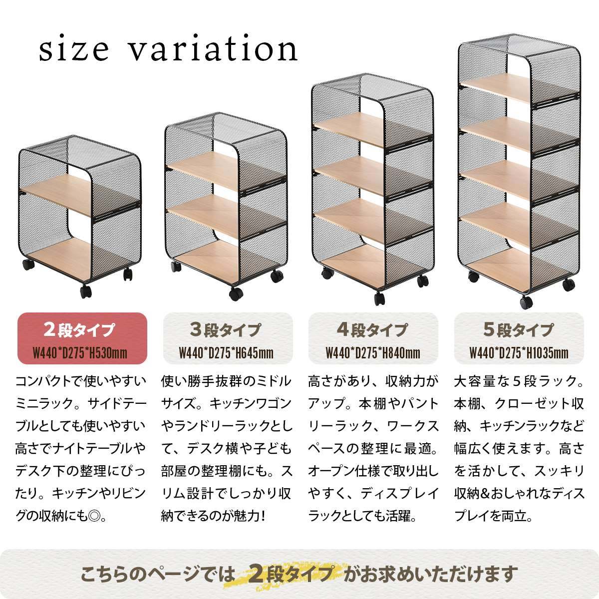 2段タイプのキャスター付きラックは、コンパクトで使いやすく、収納としての使用はもちろん、サイドテーブルやナイトテーブル、デスクサイドワゴンとしての使用にもおすすめです。