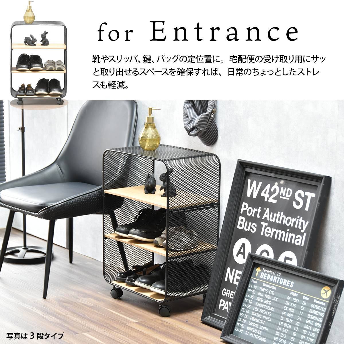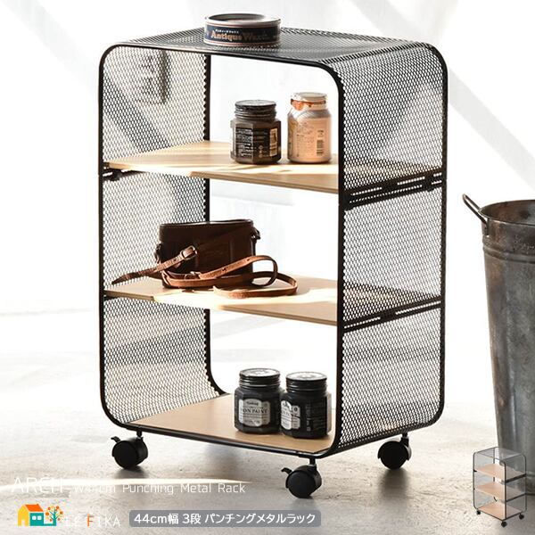 アーチ型のパンチングメタル(スチール製)を使用しており、メッシュ網よりも強度が強く、キャスター付きで移動も簡単な3段タイプのパンチングメタルラックです。