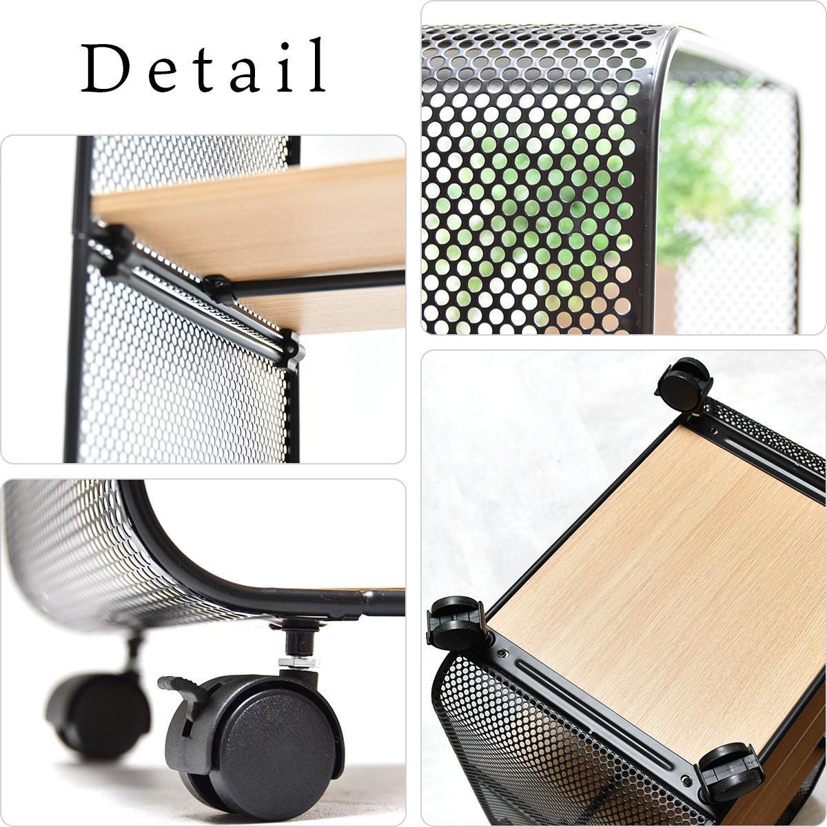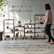 ブラックのスチールフレームと、木目調の棚板でスタイリッシュなデザインに仕上げた機能性にもデザイン性にもこだわったキャスター付きラックです。