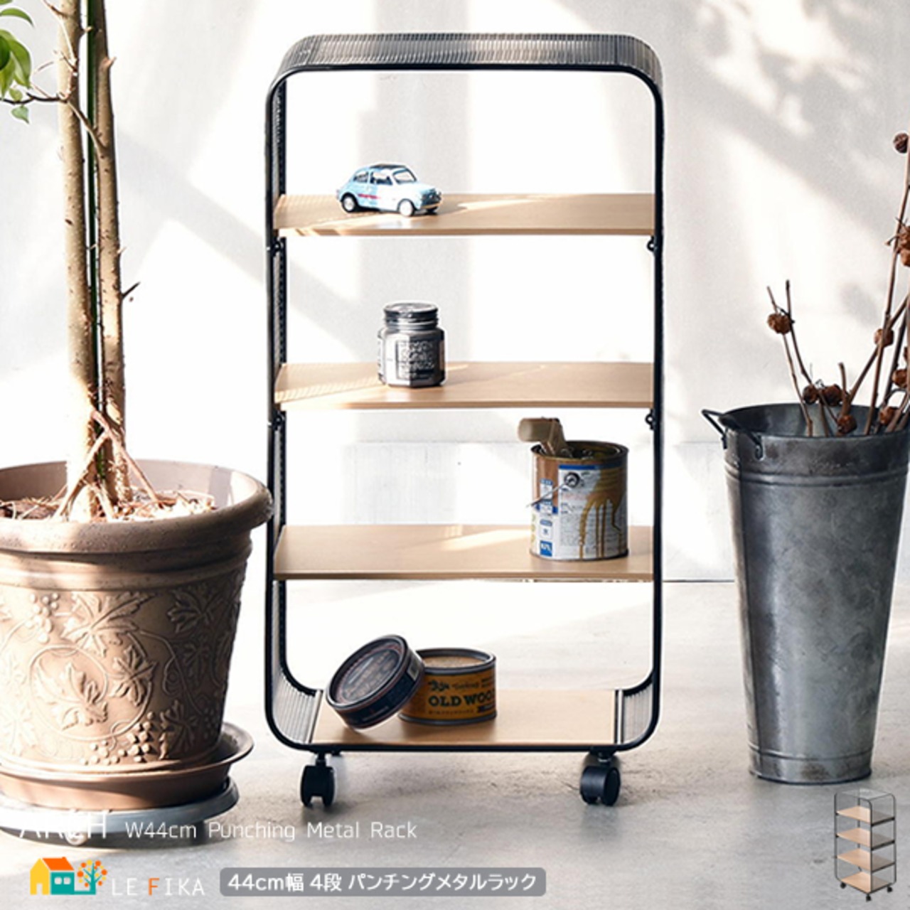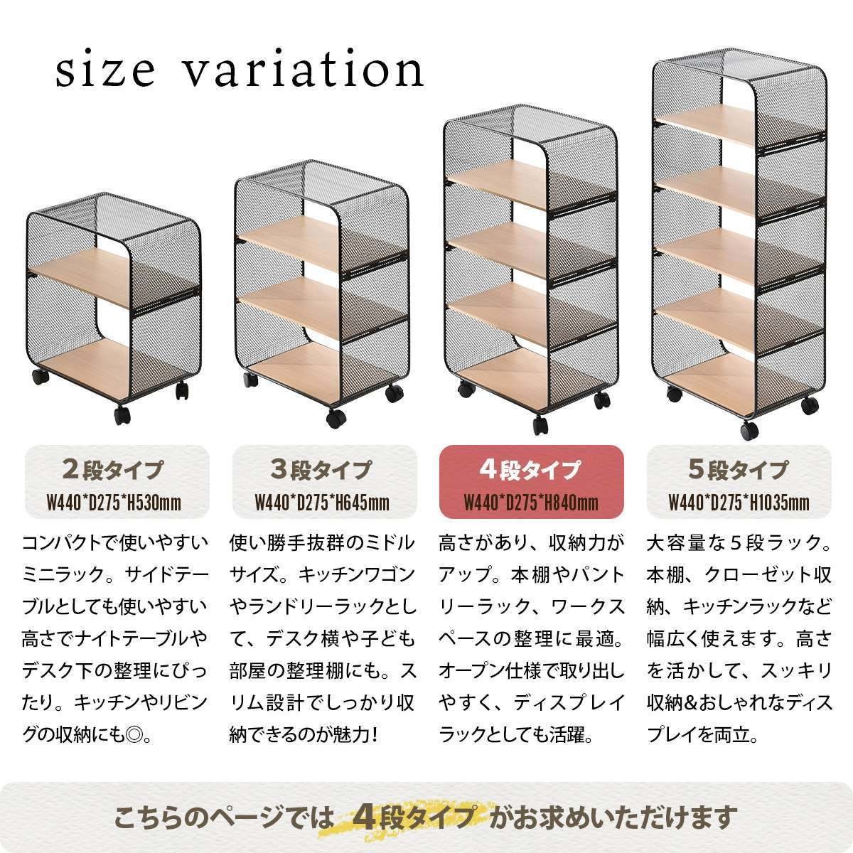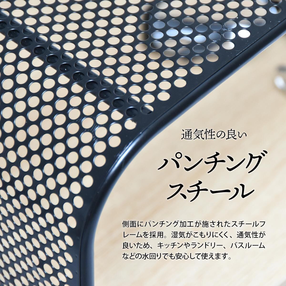 アーチ型のパンチングメタル(スチール製)を使用しており、メッシュ網よりも強度が強く、キャスター付きで移動も簡単な4段タイプのパンチングメタルラックです。