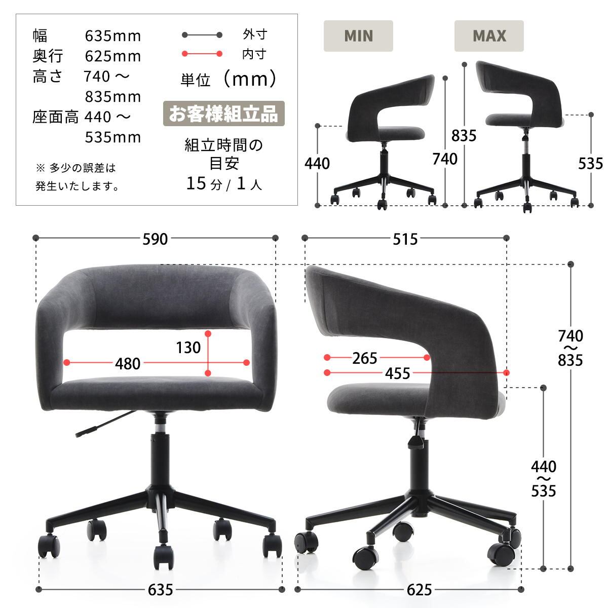 ■商品サイズ(約):幅63.5cm、奥行62.5cm、高さ74cm〜高さ83.5cm、座面高44cm〜座面高53.5cm