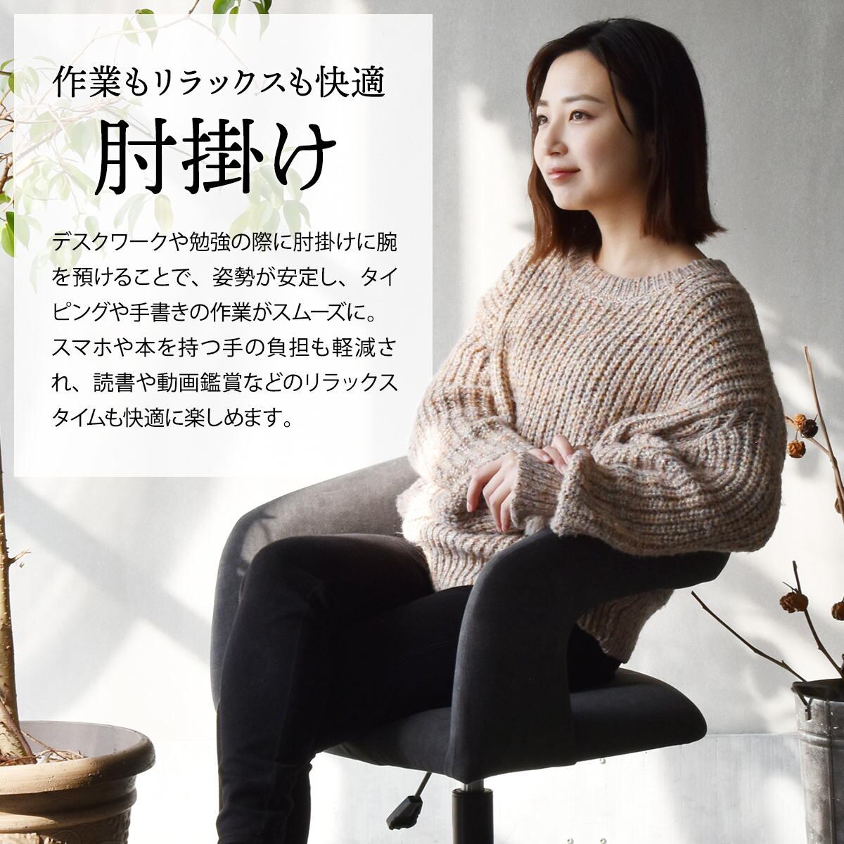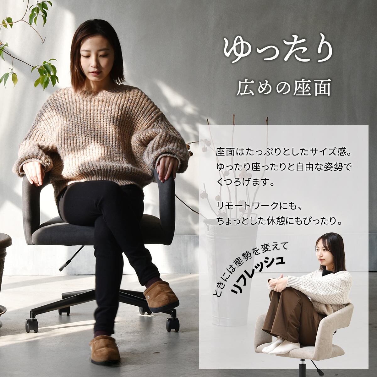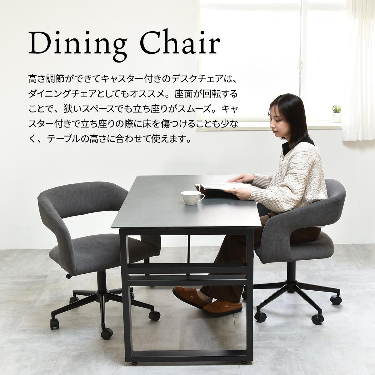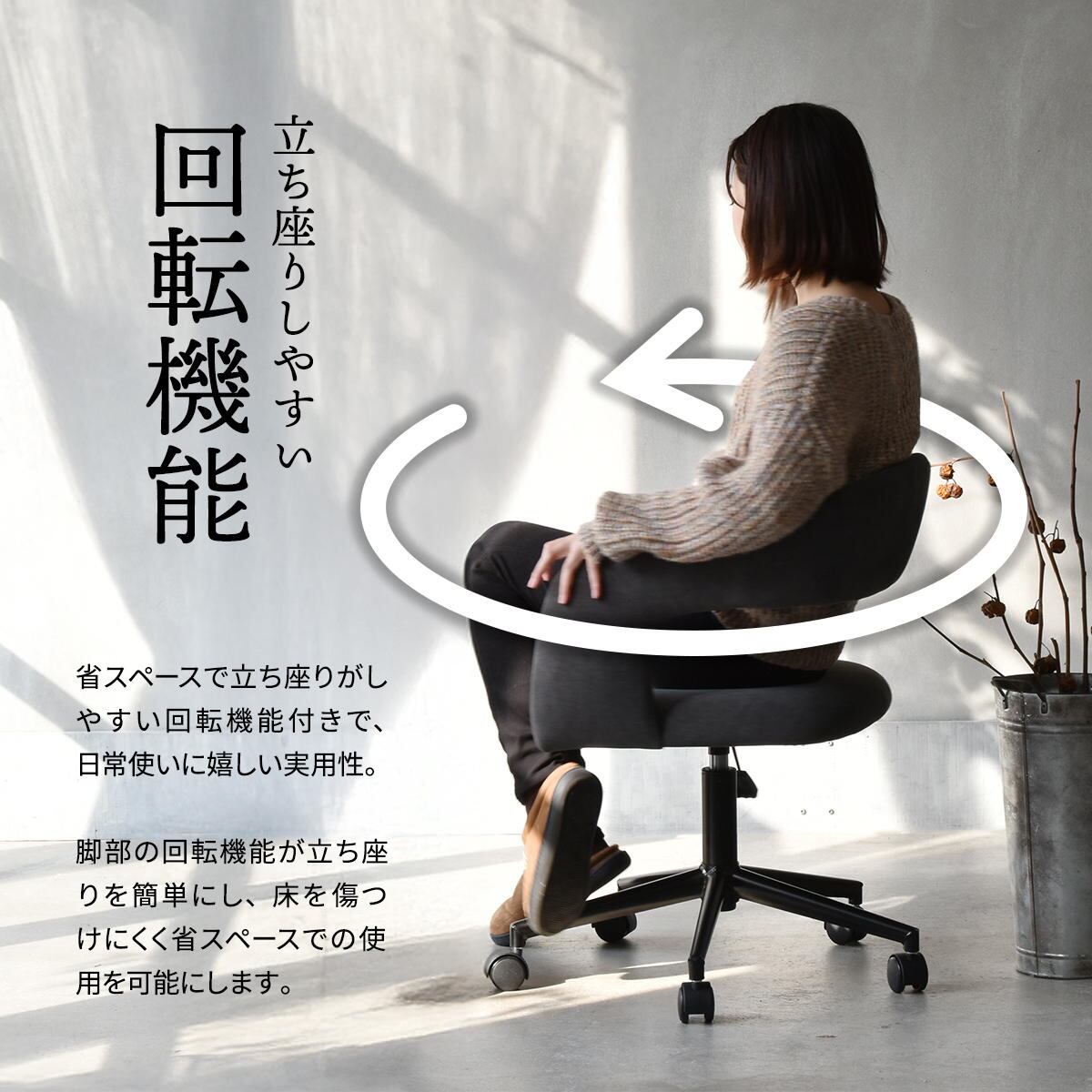 省スペースでも立ち座りがしやすい回転機能付きで、日常使いにも嬉しいデザイン性にもこだわったチェアです。