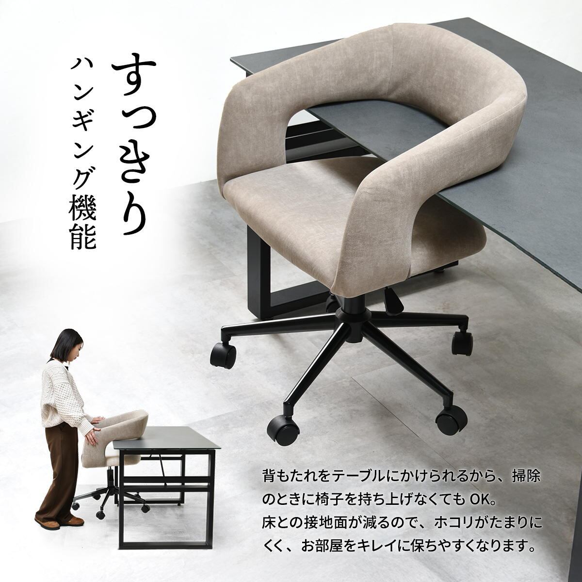 背もたれ部分をテーブルやデスクにかけることができるので、掃除の際にも便利です。
