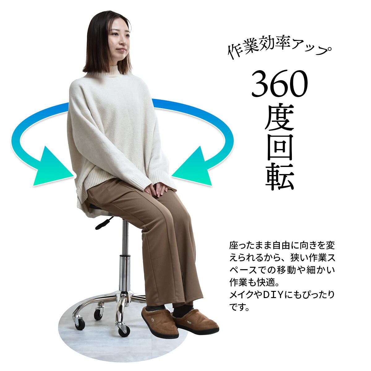 座面が360度回転し、省スペースで向きを変えやすいガス圧式の昇降スツールです。