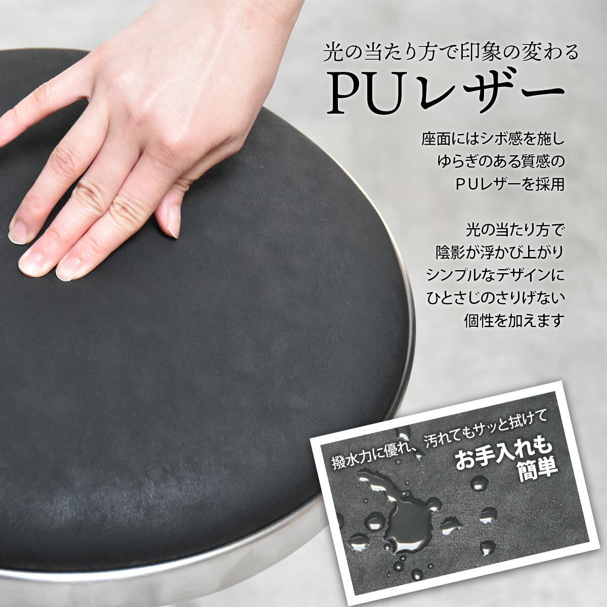 座面には水や汚れを簡単に拭き取りやすいPUレザーを採用しており、スチールのフレームとも相性の良い、デザイン性にもこだわったスツールです。