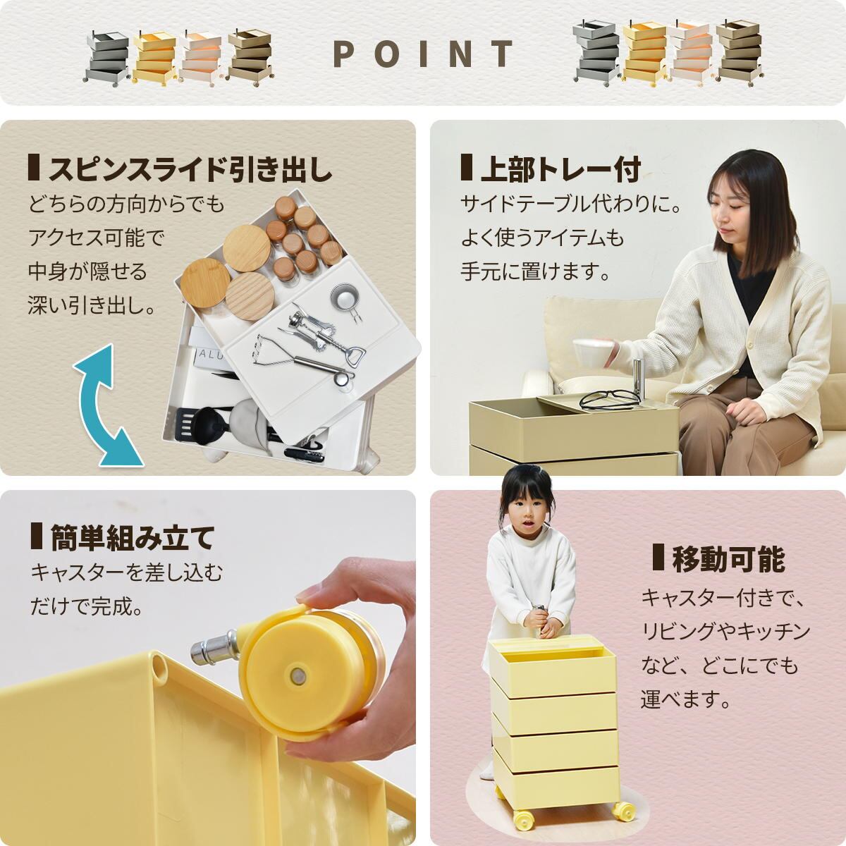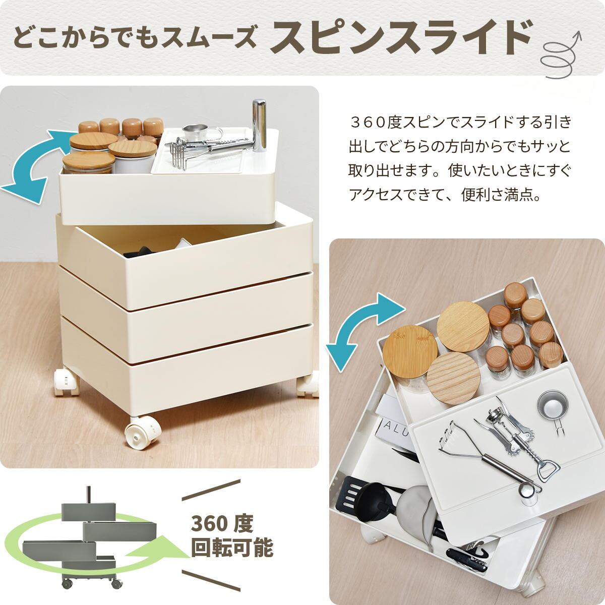 360度スピンでスライドする引き出しは、どちらの方向からでも使いたい物を使いたい時にサッと取り出すことができる機能性にこだわった収納ワゴンです。