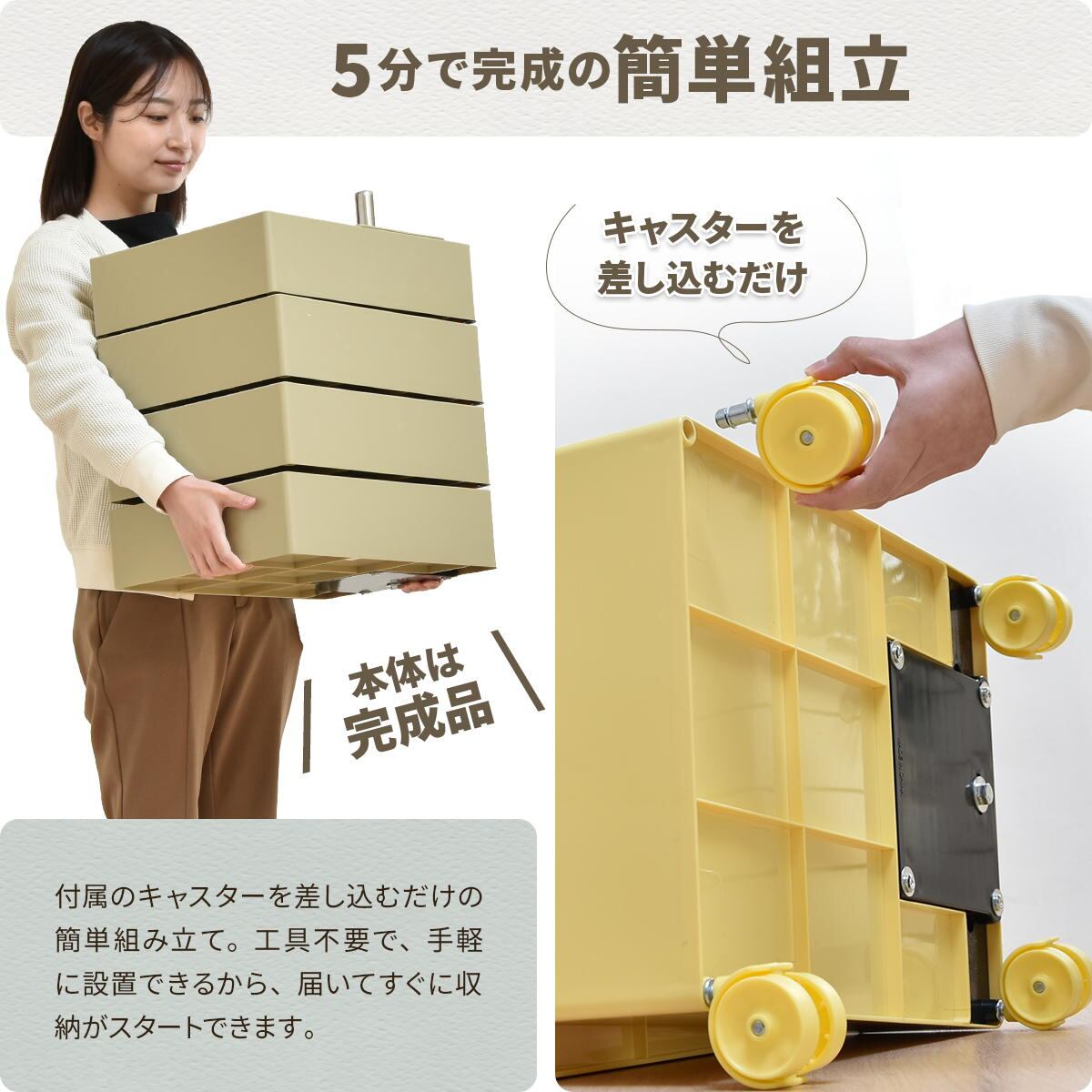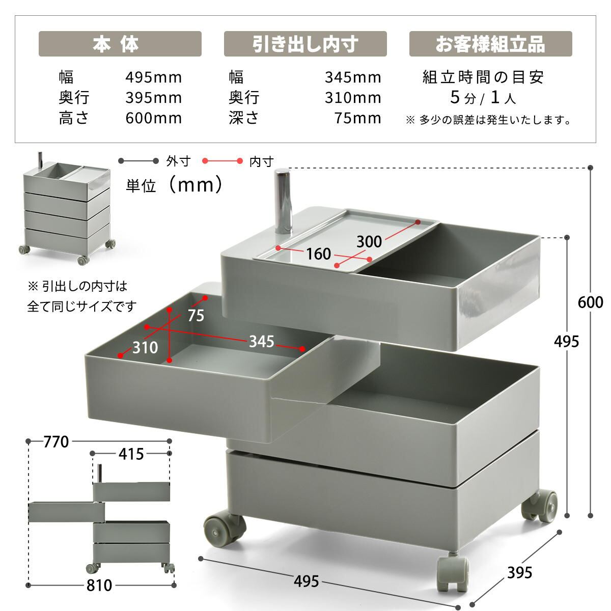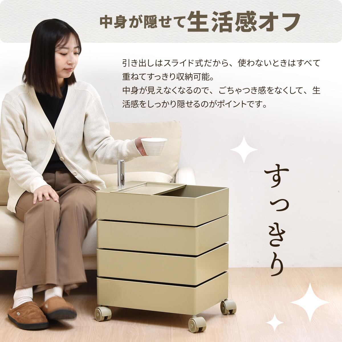キャスター付きで360度回転するスライド引き出しが特徴的な49.5cm幅の4段収納ワゴンです。