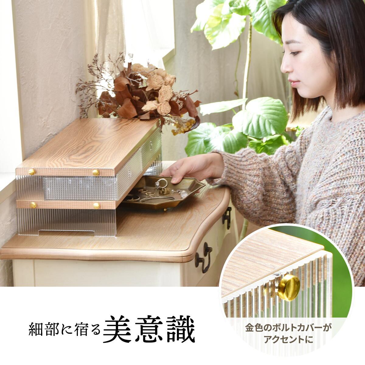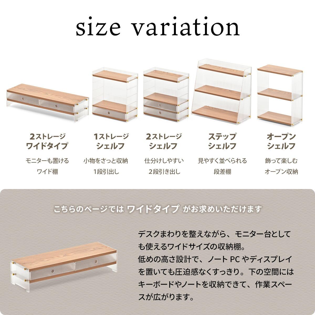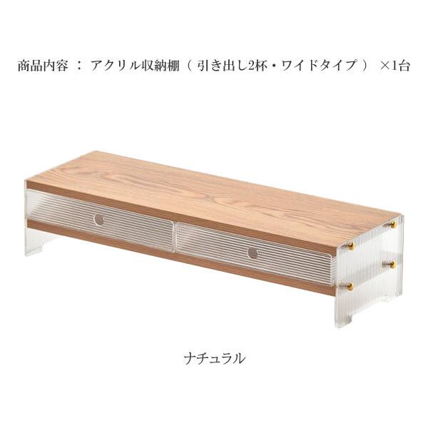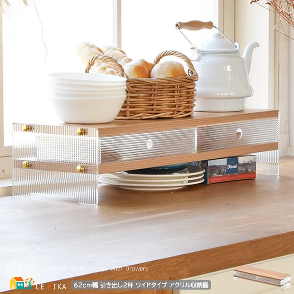 アクリル収納棚 引き出し2杯ワイドタイプ 62cm幅 ナチュラル アクリルラック 収納棚 モニター台 デスク収納 キッチン収納 おすすめ おしゃれ モダン 木目調 透明 キッチン収納棚 ワイドタイプ 引き出し2杯付き モニター台 収納ラック アクリル収納ラック
