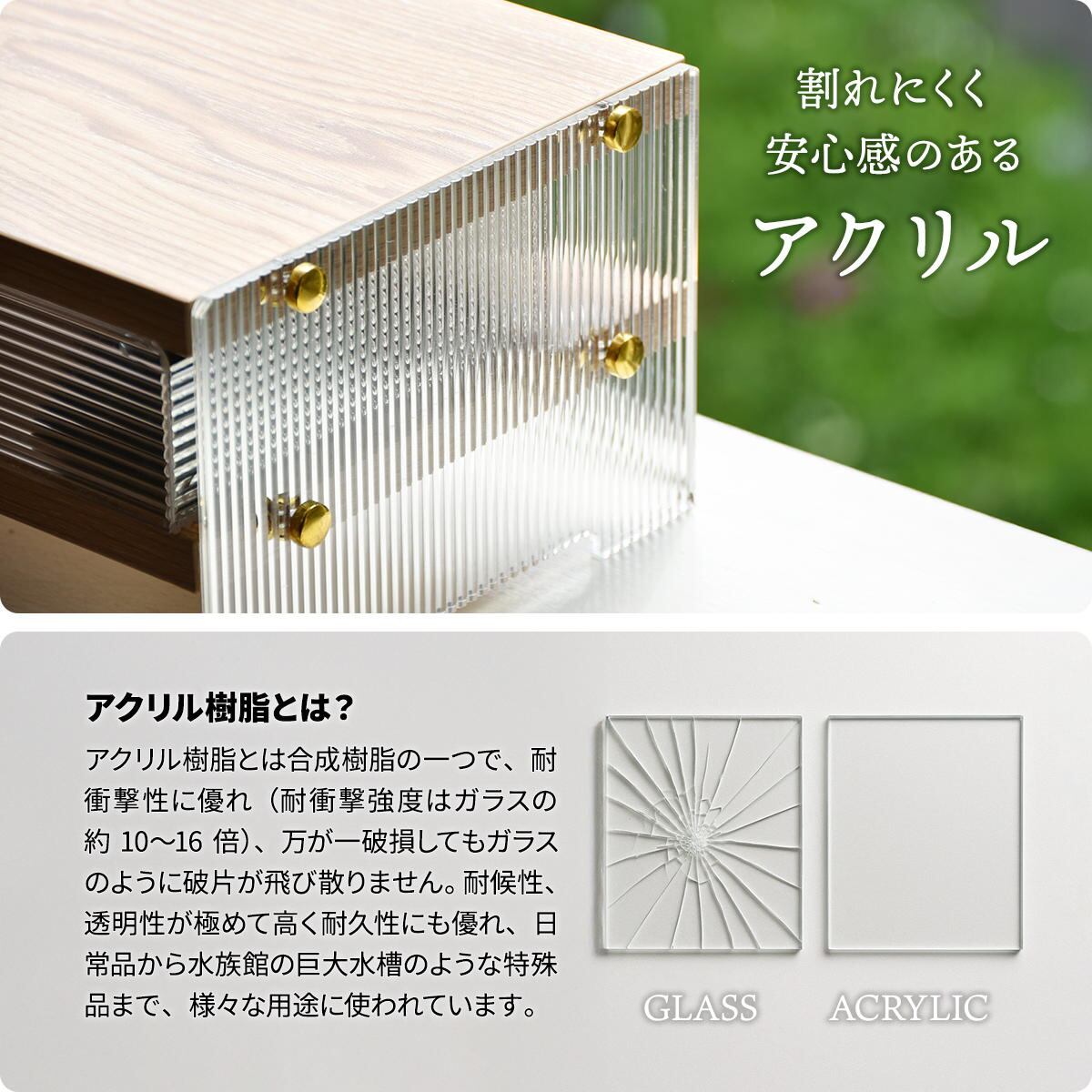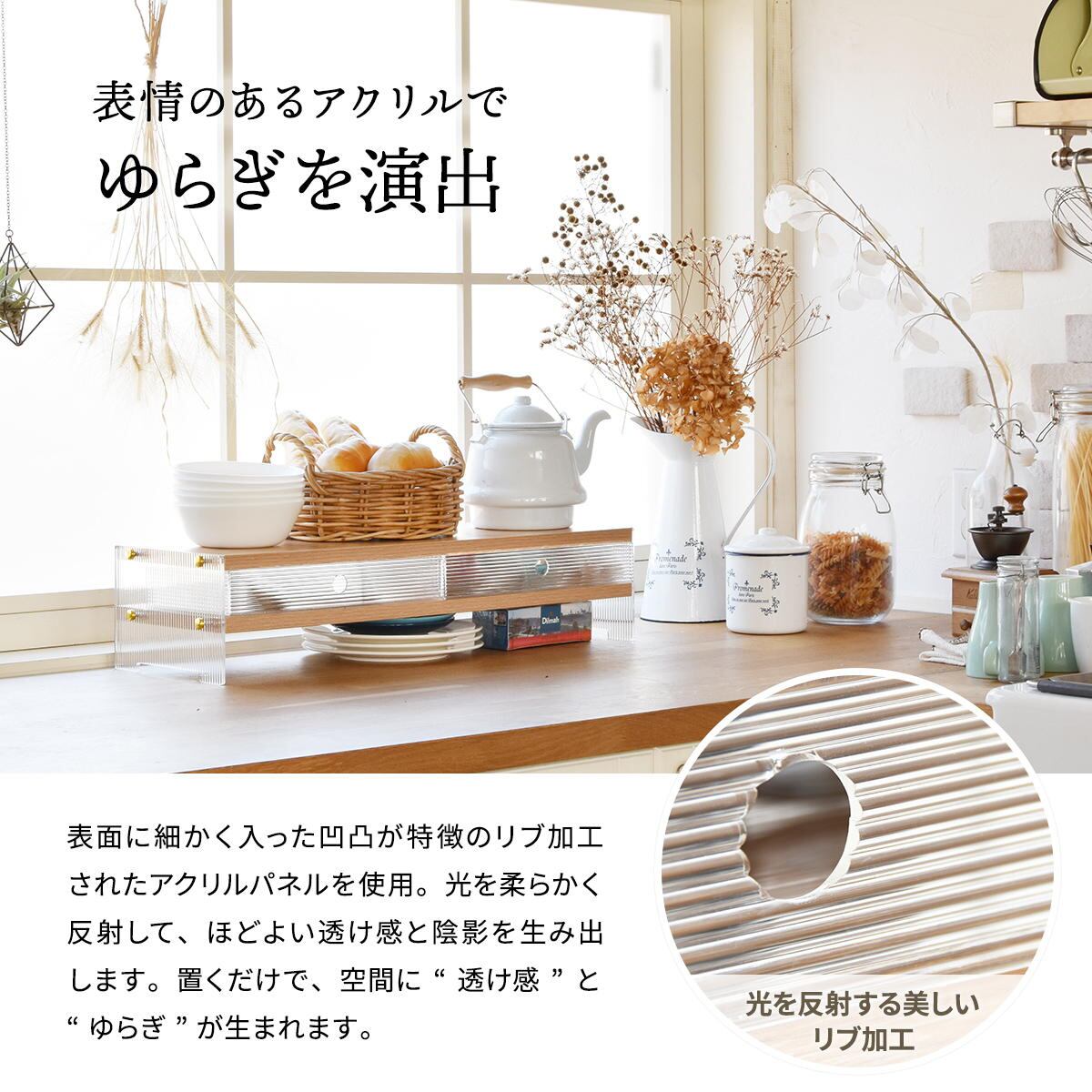 表面に細かく入った凸凹が特徴のリブ加工されたアクリルパネルを使用しており、光を柔らかく反射して、ほどよい透け感と陰影を生み出します。