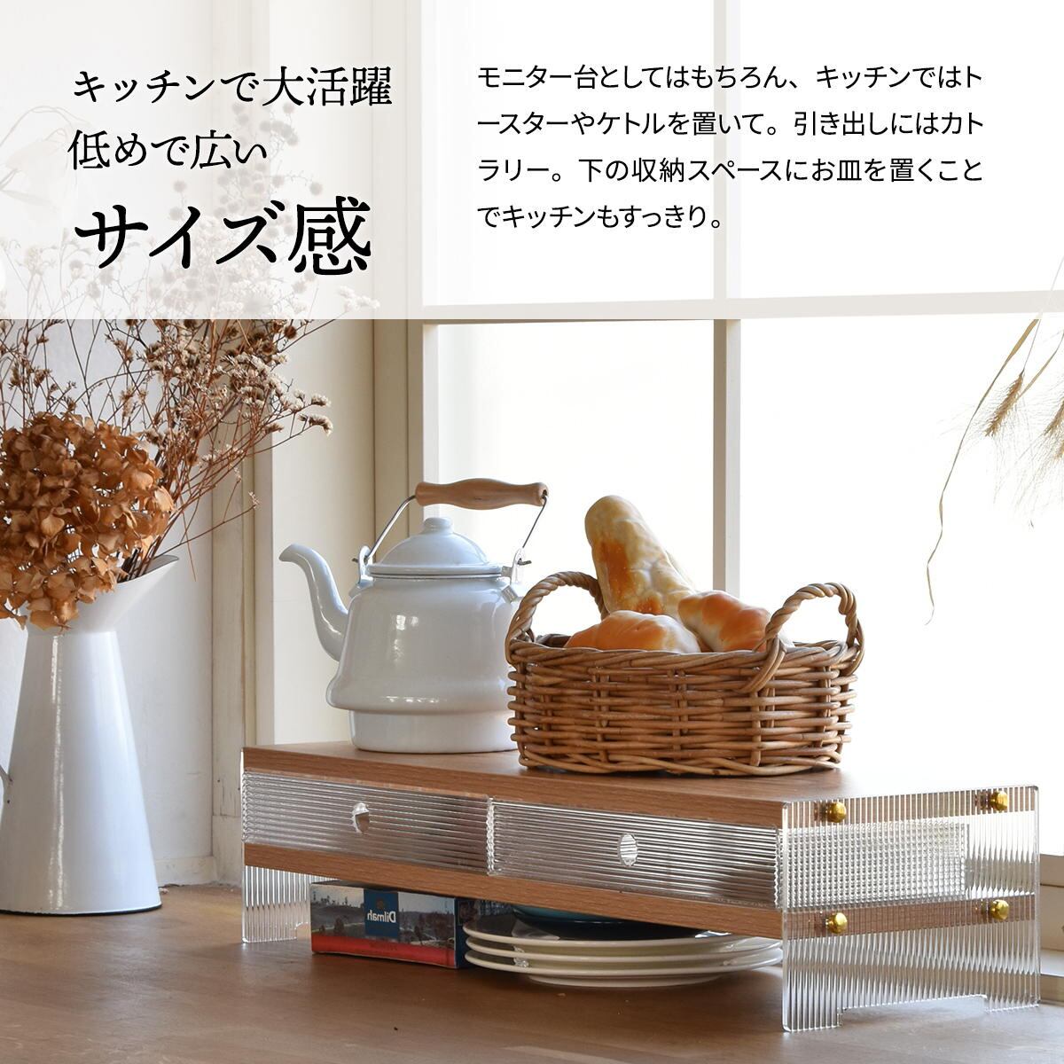 モニター台としての使用はもちろん、キッチンでは天板にトースターやケトル、引き出しにはカトラリー、下収納スペースにはお皿を置くことでキッチンまわりをスッキリと整えることができます。