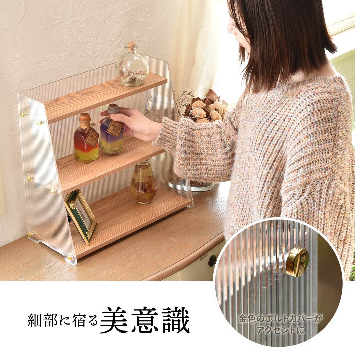 スパイスやコスメボトル、アロマなどを整然と美しくディスプレイしながら収納できるアクリル収納棚です。