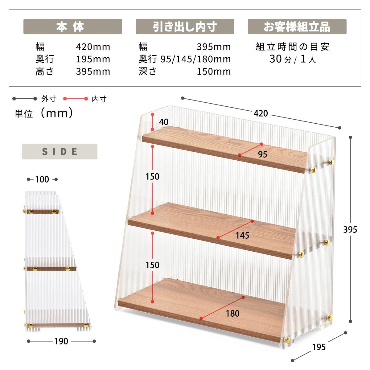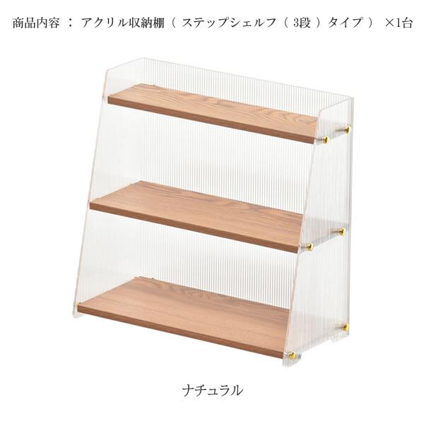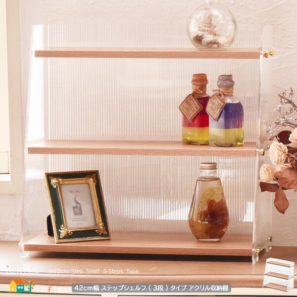アクリル収納棚 ステップシェルフ 3段タイプ 42cm幅 ナチュラル アクリルラック 収納棚 収納シェルフ ディスプレイラック コスメ収納 化粧品収納 ディスプレイ棚 文房具収納 おすすめ おしゃれ 北欧 モダン スタイリッシュ 透明 キッチン収納 デスク収納 3段棚 3段収納棚 3段収納ラック コンパクト スリム 省スペース アクリル収納ラック