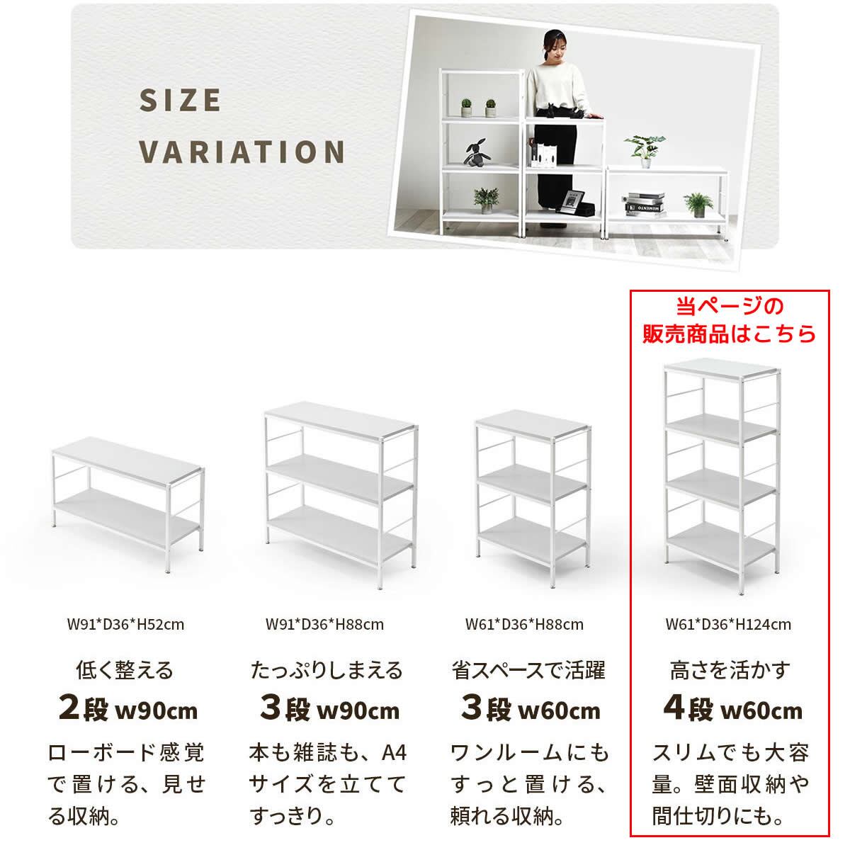 A4ファイルも収納可能な60cm幅(アジャスターを含む幅61cm)の4段オープン収納ラックです。