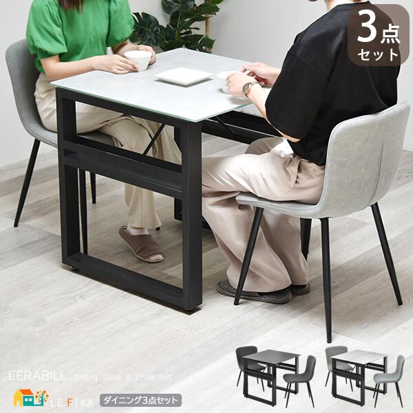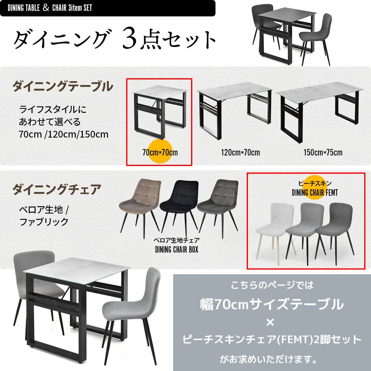 天板ガラスの表面にセラミック焼き付け加工を施した70cm幅のダイニングテーブル1台と、ピーチスキン生地のダイニングチェア2脚、合計3点セットです。