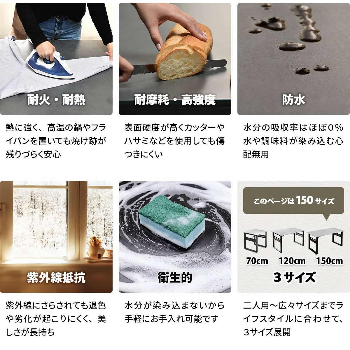 テーブル天板はセラミック焼き付け加工が施されているので熱に強く、熱いお鍋などを直接置いても変色、変形なく、またキズにも強いので天板をまな板代わりに使ってもキズがつきにくいです。