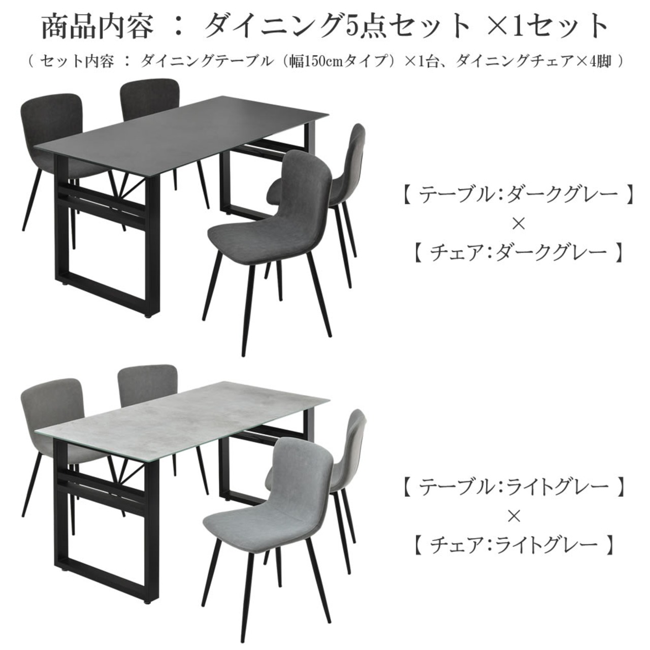 ダイニング5点セット ダイニングテーブル1台 ダイニングチェア4脚 合計5点セット テーブル150cm幅 ダークグレー ライトグレー 長方形テーブル おすすめ おしゃれ モダン ピーチスキンチェア ダイニングチェア アームレスチェア 肘掛け無し 食卓椅子 ダイニングテーブルセット