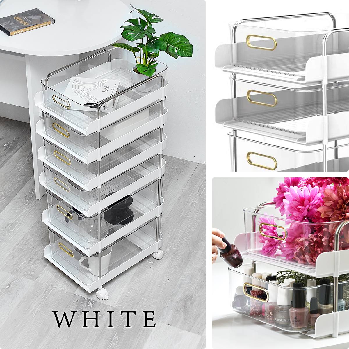 コスメなどの収納はもちろん、日用品や雑貨など、まとめて収納可能なので、キッチンやオフィス、トイレやベッドルームなど、様々な場所に設置することができます。