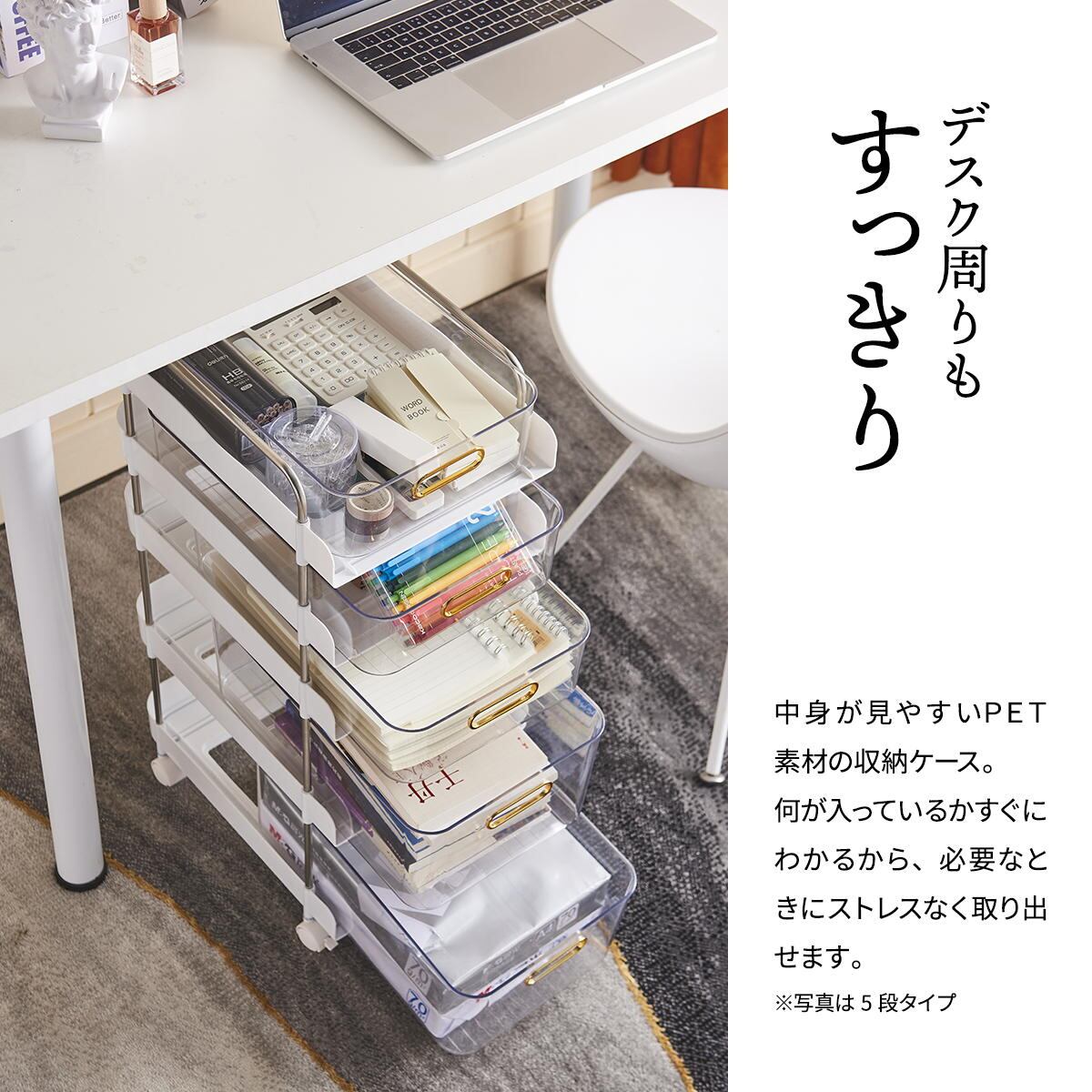 透明な引き出しタイプで中身が一目瞭然で整理しやすく、忙しい朝もメイク用品などを探す際にスムーズに使用可能です。