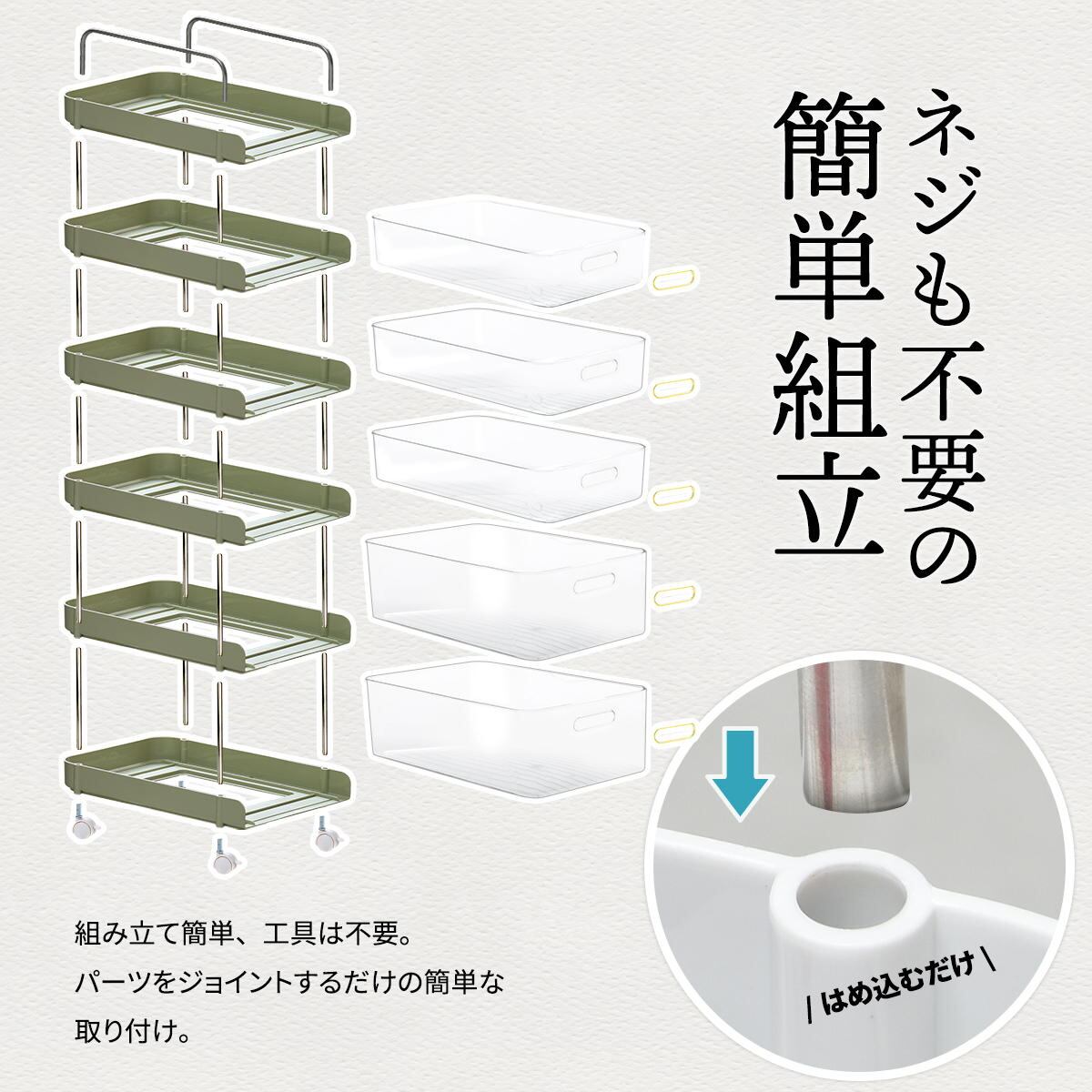 工具が必要なく挿し込むだけで組立が完成するキャスター付きの6段ワゴンラックです。