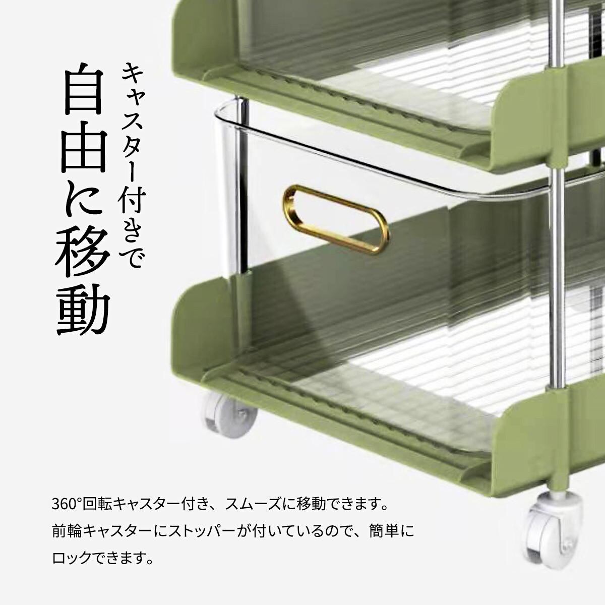 360度回転キャスター付きで、スムーズに移動が可能で、ストッパー付きキャスターが2点付属しているので、簡単に固定することもできます。