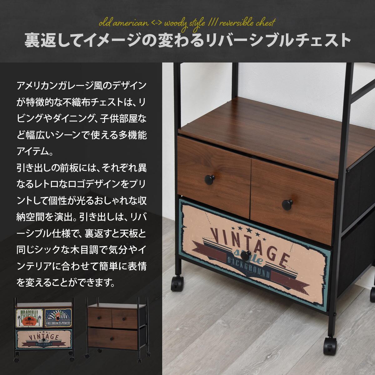 引き出しの前板面はリバーシブル仕様で、片側はそれぞれ異なるレトロなロゴデザインがプリントされた面と、もう一方は天板と同じシックな木目調の仕様で、気分や雰囲気に合わせて表情を変えることができます。