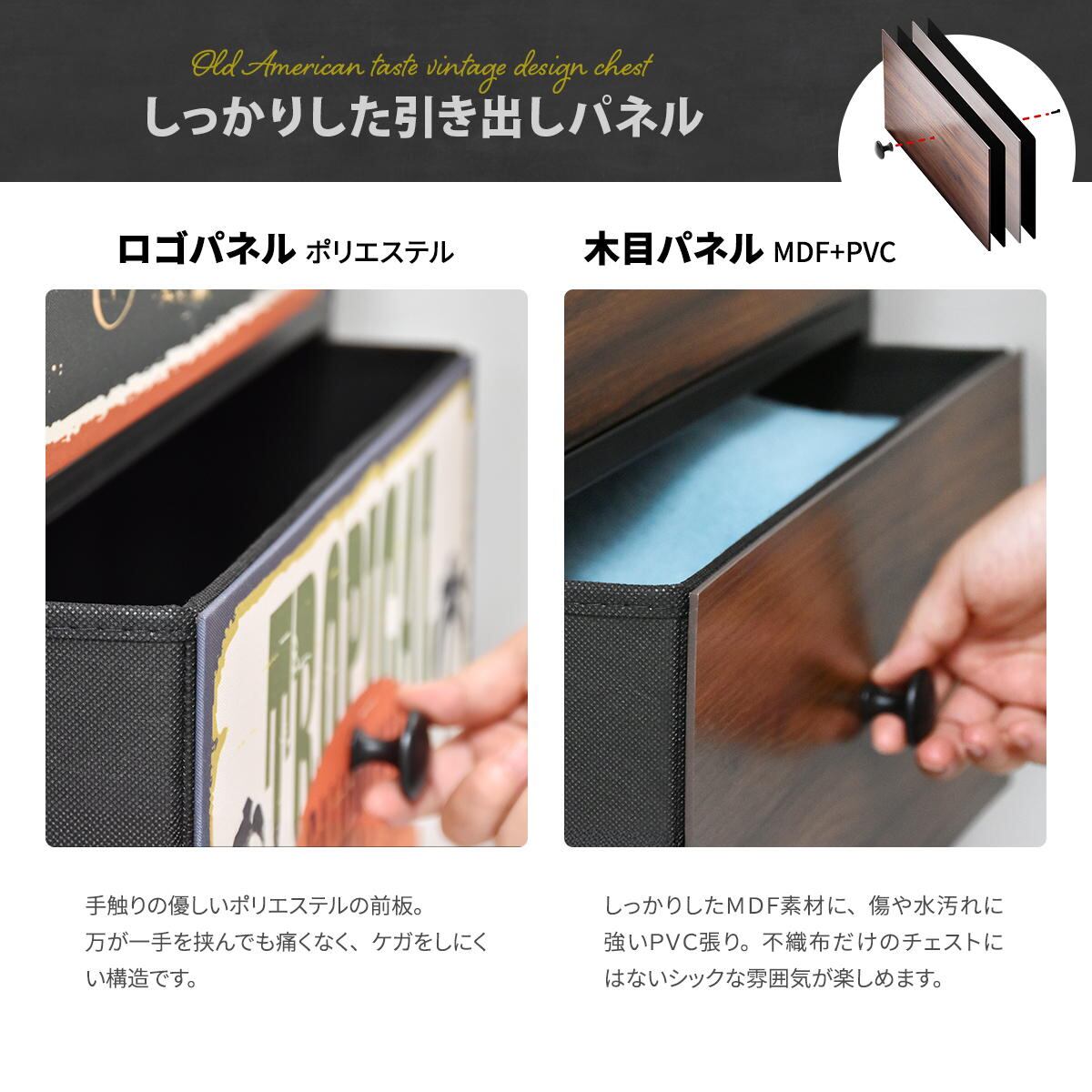 ・背板、引き出し後ろ板:中質繊維板にPVC貼り