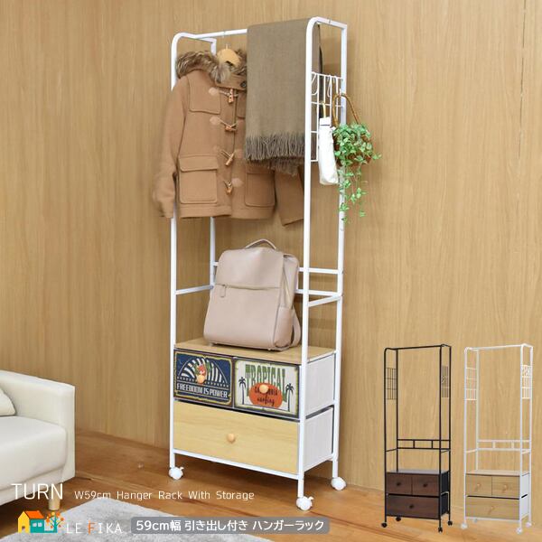 ハンガーラック 59cm幅 ダークブラウン ホワイト キャスター付きハンガーラック チェスト付きハンガーラック 引き出し収納付きハンガーラック おすすめ おしゃれ 北欧 モダン スタイリッシュ 木目調柄 リビング収納 子供部屋収納 衣類ラック 洋服ハンガー 衣類ハンガー 鞄収納 ディスプレイ収納 引き出しデザインリバーシブル 引き出し前後リバーシブル仕様 フック付き 引っ掛け収納